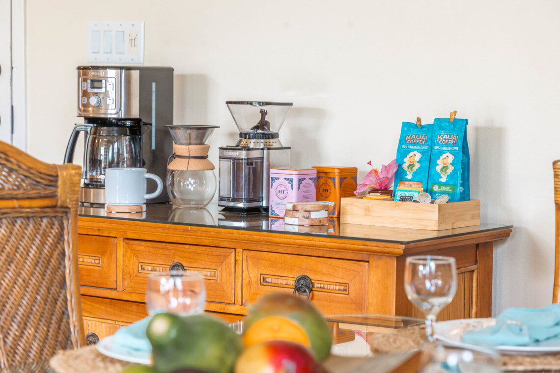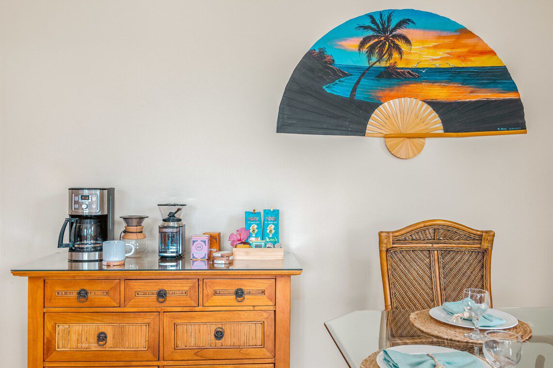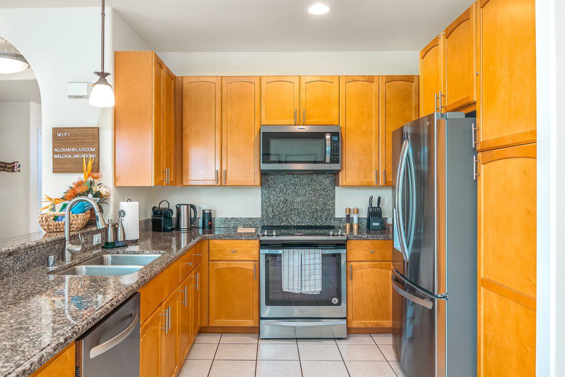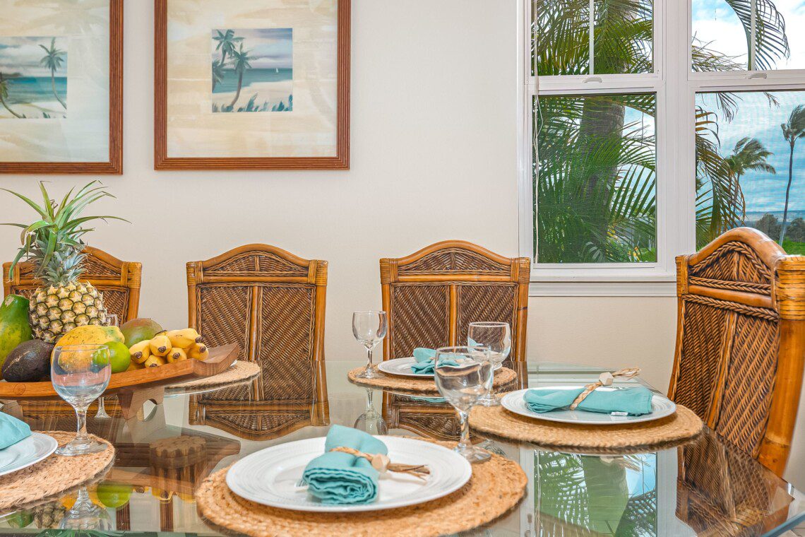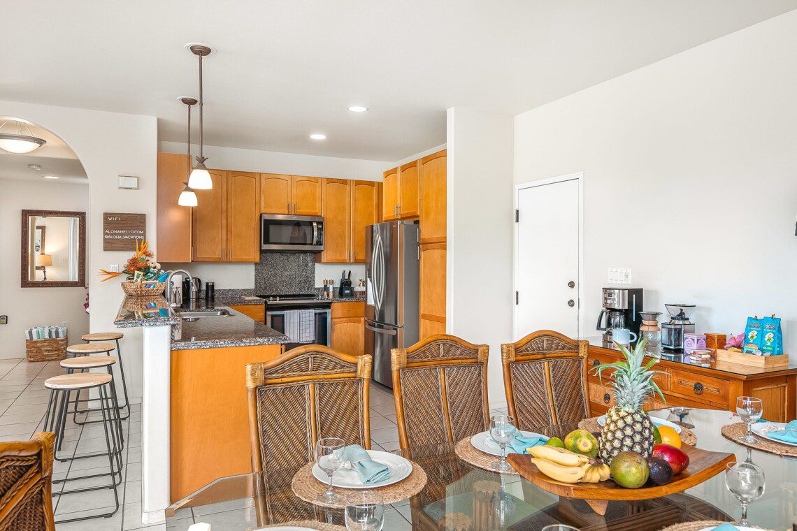 Fully stocked kitchen with modern appliances and a dining area that opens to the lanai with additional seating. Whether you’re preparing island-inspired meals or enjoying takeout, everything you need is at your fingertips.