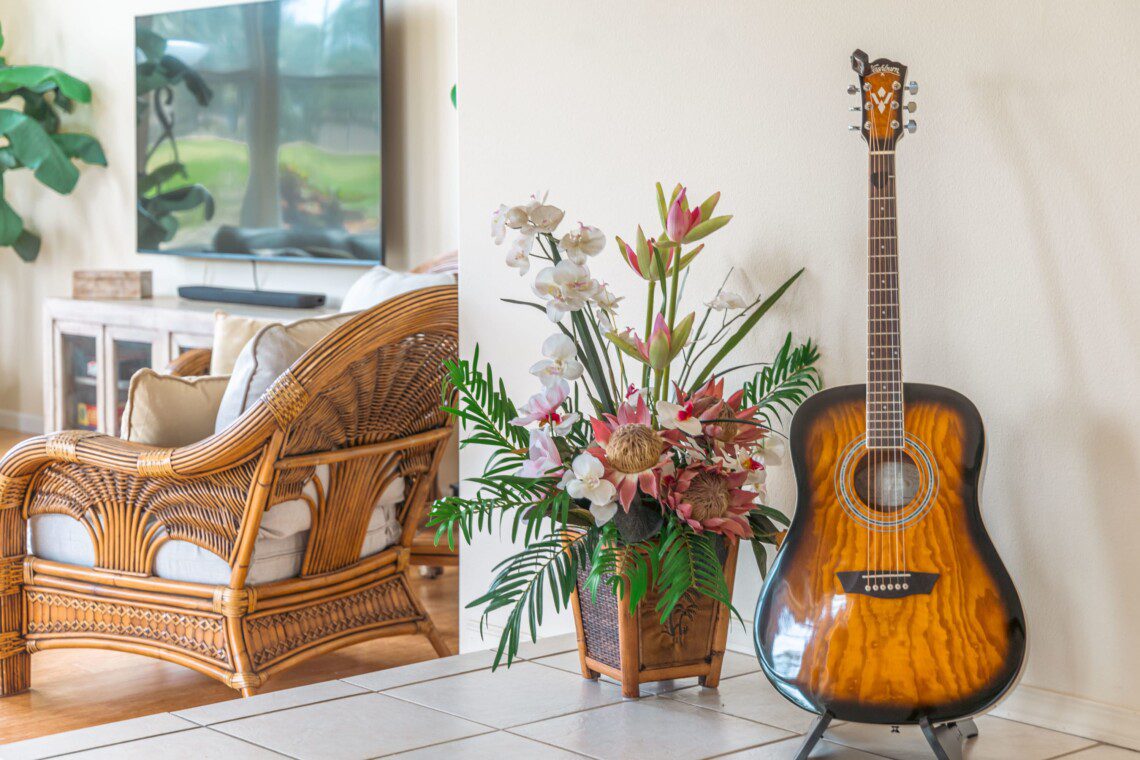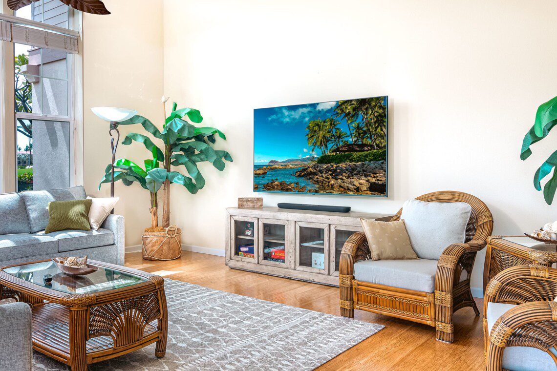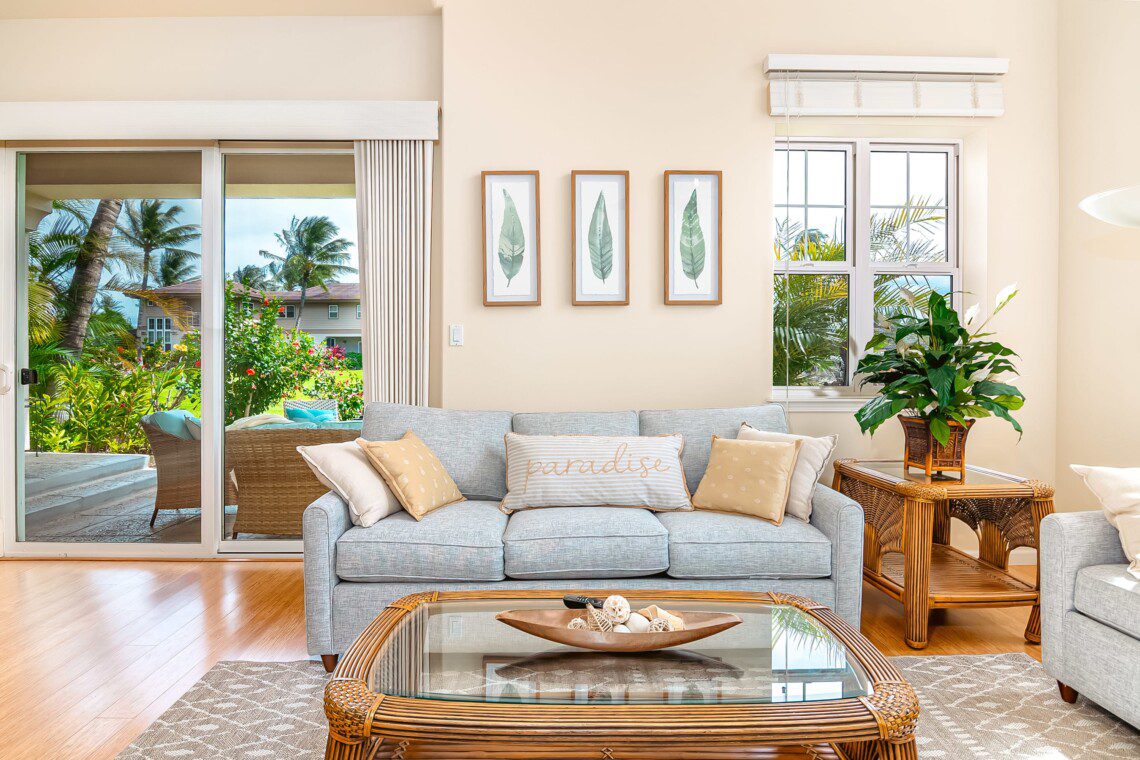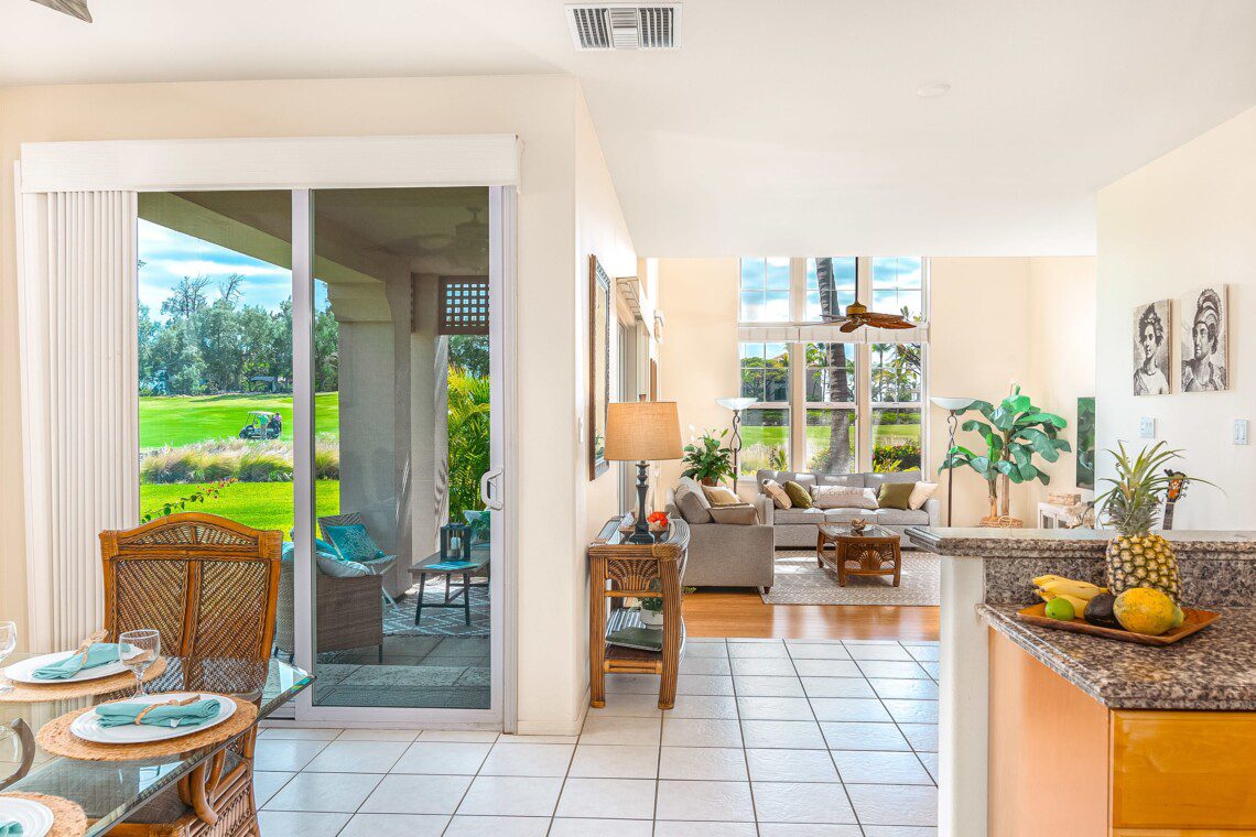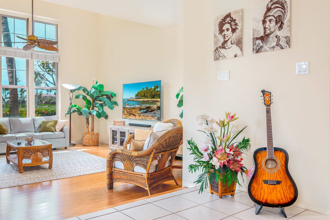 Bright and airy living room with soaring vaulted ceilings, opening onto an expansive lanai overlooking the green fields and golf course — the perfect place to unwind and take in the aloha spirit.