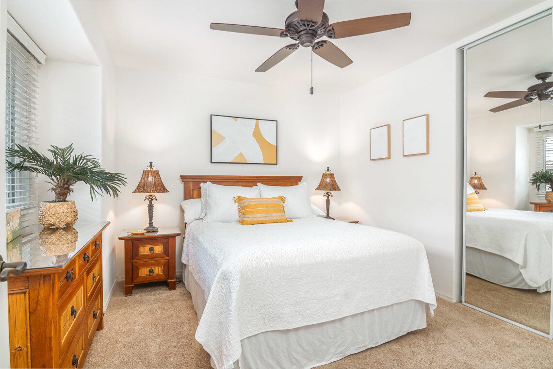 Hall bedroom with king bed, ceiling fan, blackout shades.