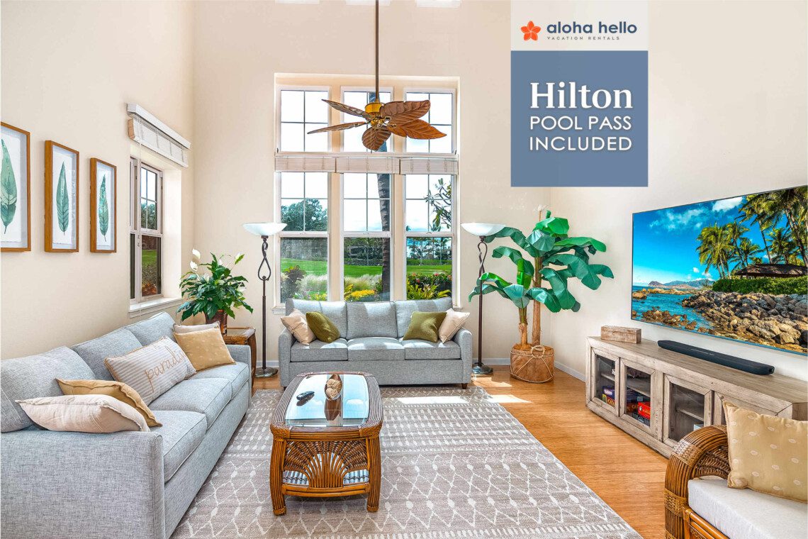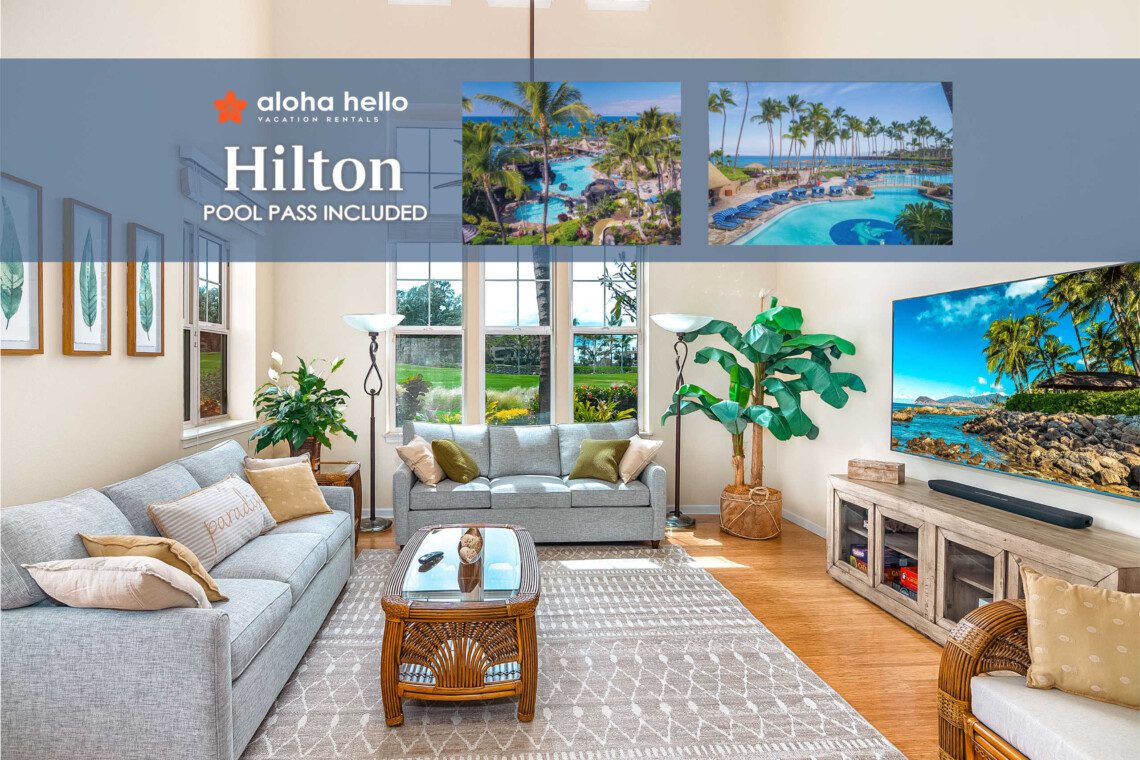 This home includes complimentary daily access (for up to 6 guests; children under 5 do not count toward the total) to the world-famous Hilton Waikoloa Village Resort, voted #1 resort in Hawaii by USA Today.