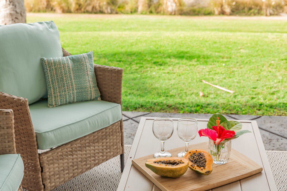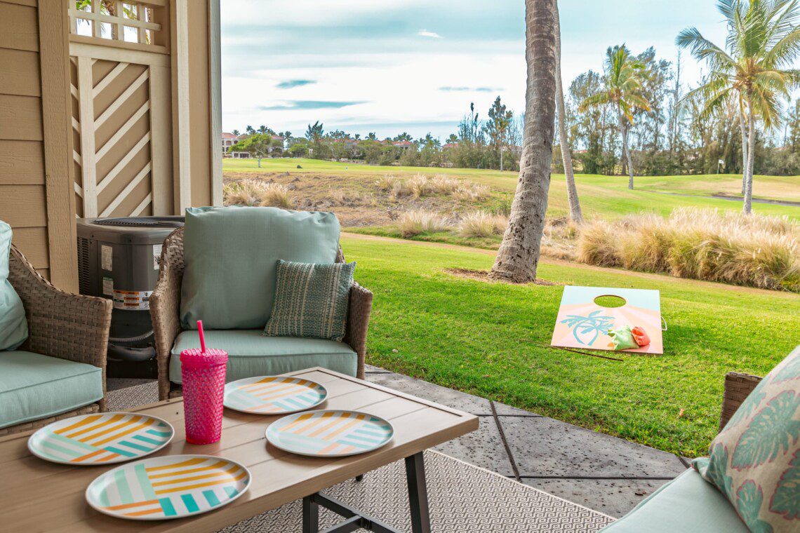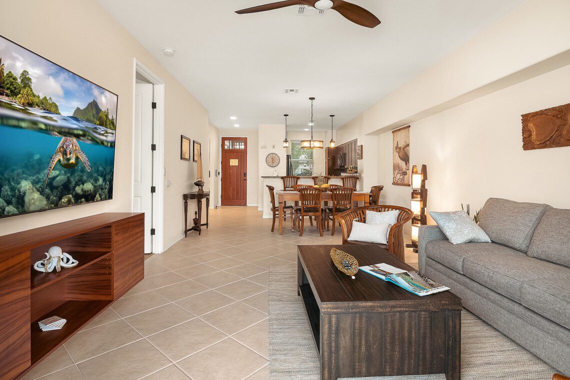 Large ground floor unit has a large attached lanai and opens to gold course. Minutes from Starbucks, restaurants, beach (A-Bay), grocery store, shopping. Green fields and mountain views. King bed, 75” TV, fully stocked with kitchen and beach supplies. Just steps away from heated saltwater pool, hot tub, fitness center, community BBQ, clubhouse. No carpet, No steps anywhere in unit. Reserved parking spot + plenty of extra parking. Inside laundry. High ceilings, lots of natural light, central a/c.