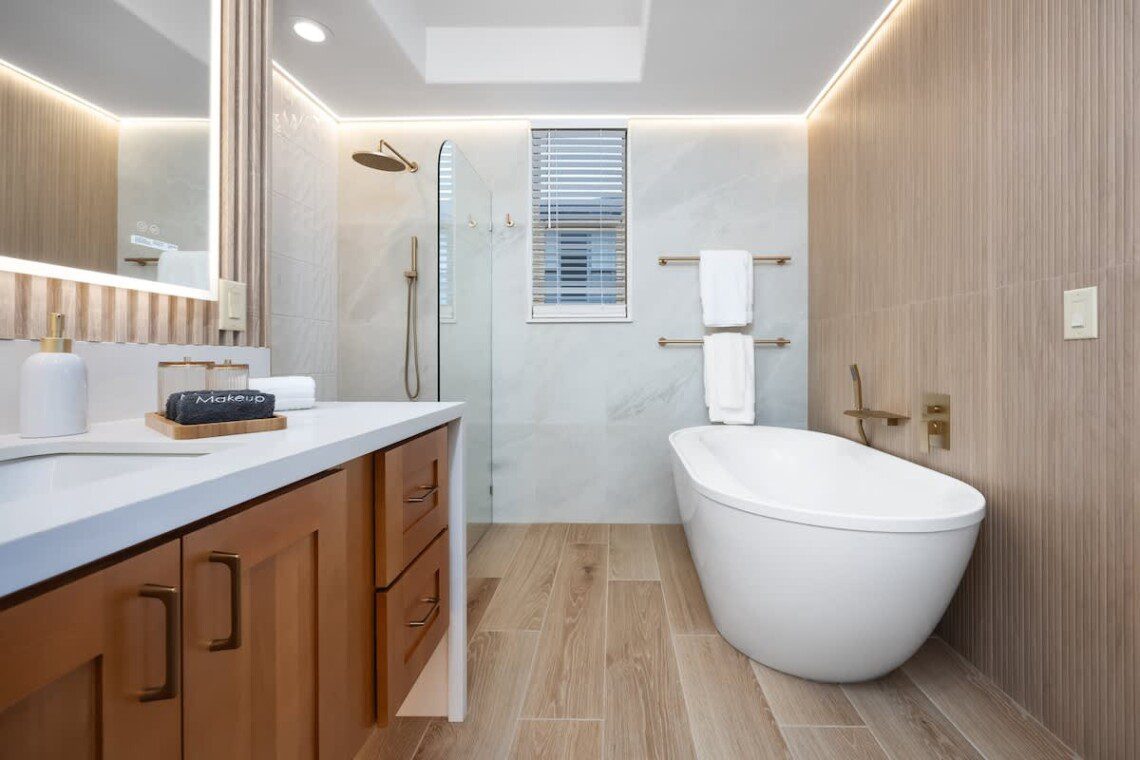 Large primary bedroom with king-size bed, smart TV, ceiling fan, blackout shades, large walk-in closet with a dresser and a private bathroom featuring oversized showers AND soaking tub. Bedroom comes with high-end mattress and 600 thread count cotton sheets.