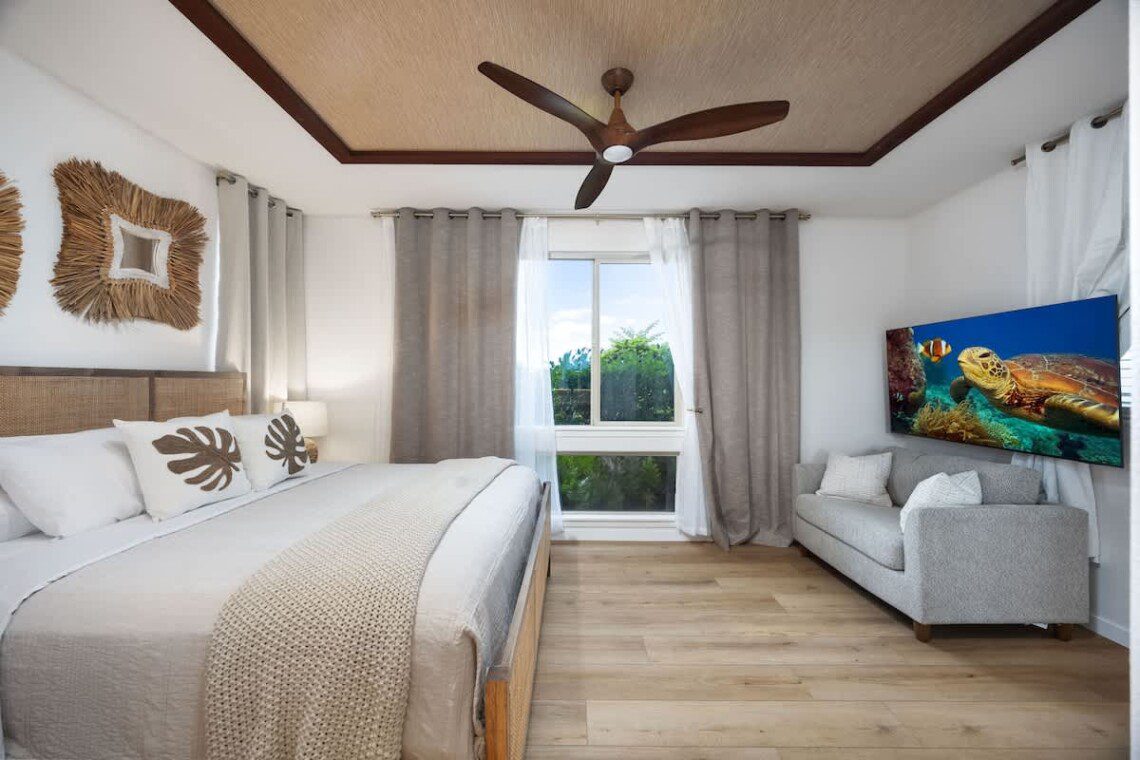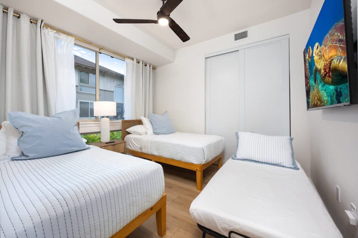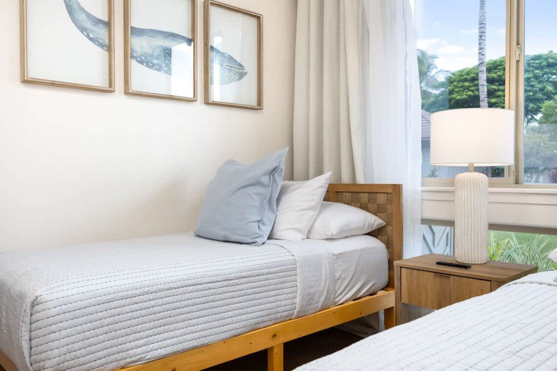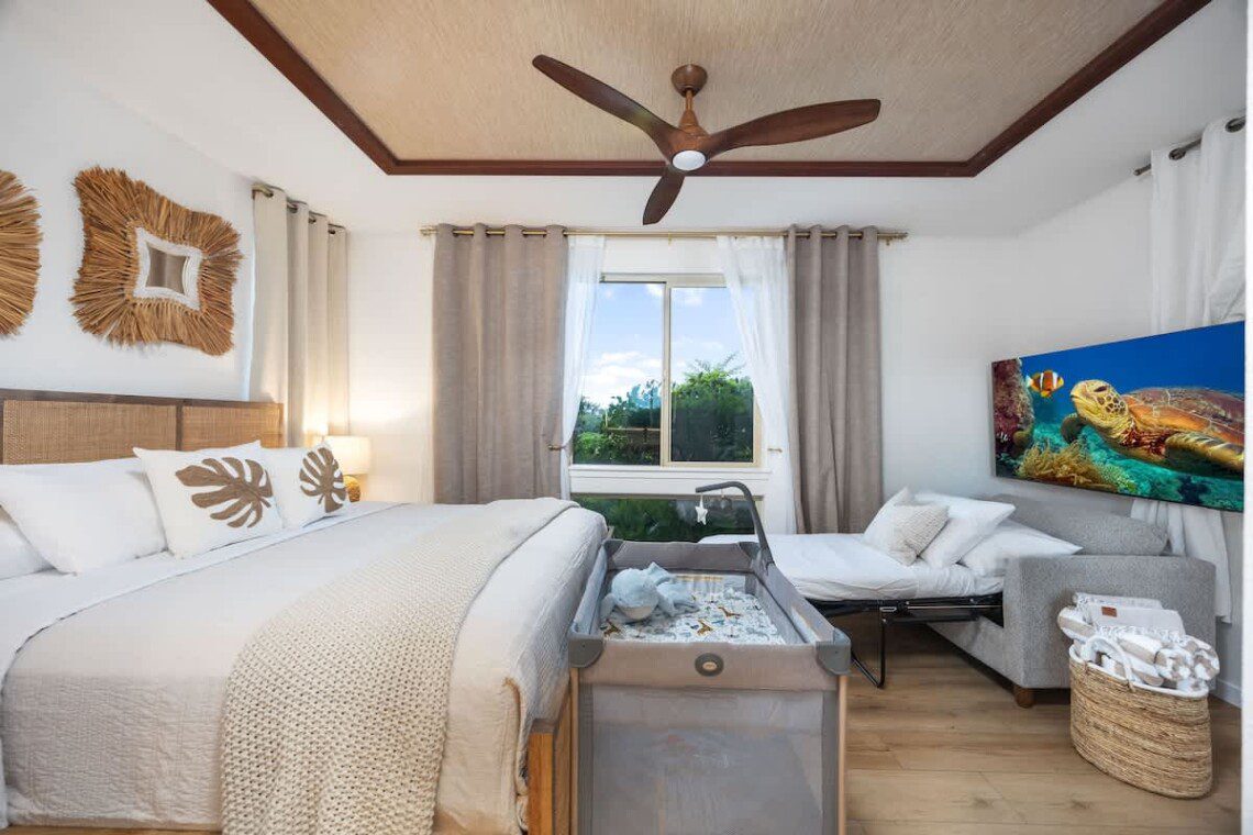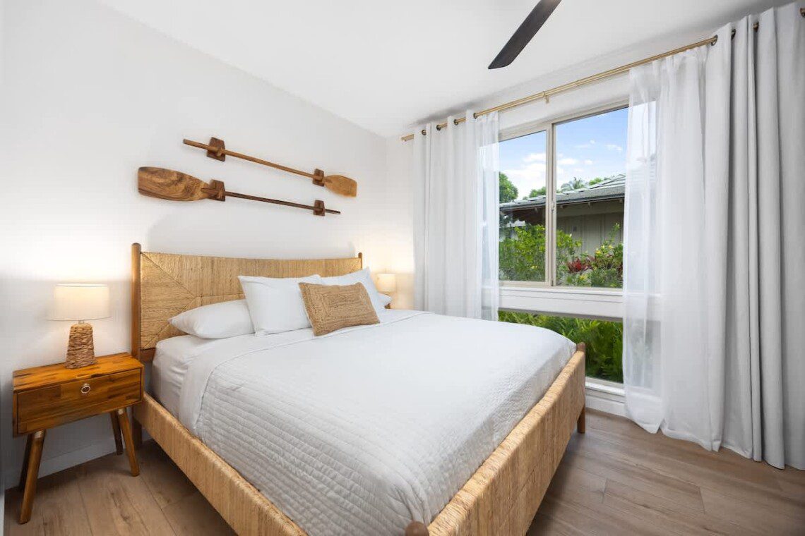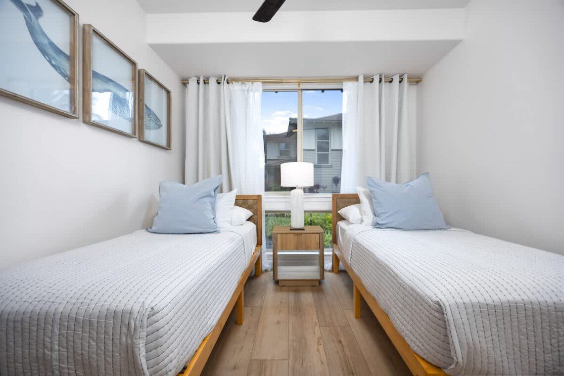 Modern Hawaiian décor, plush bedding, and blackout shades in every room for restful sleep.