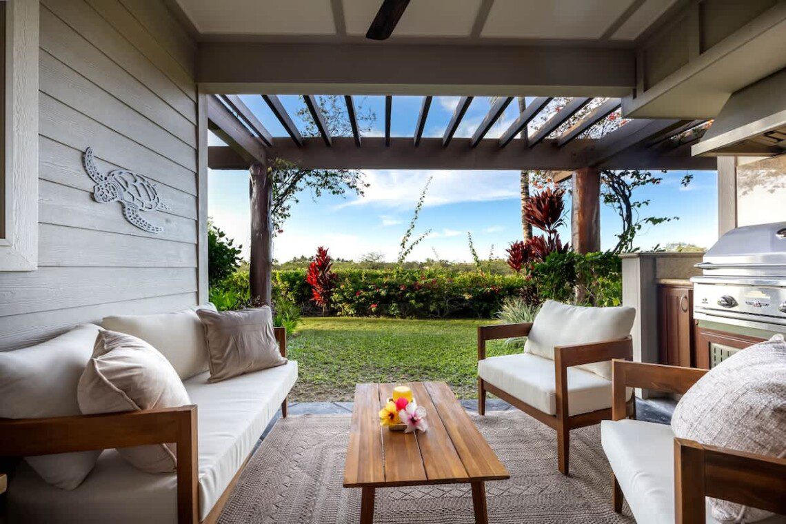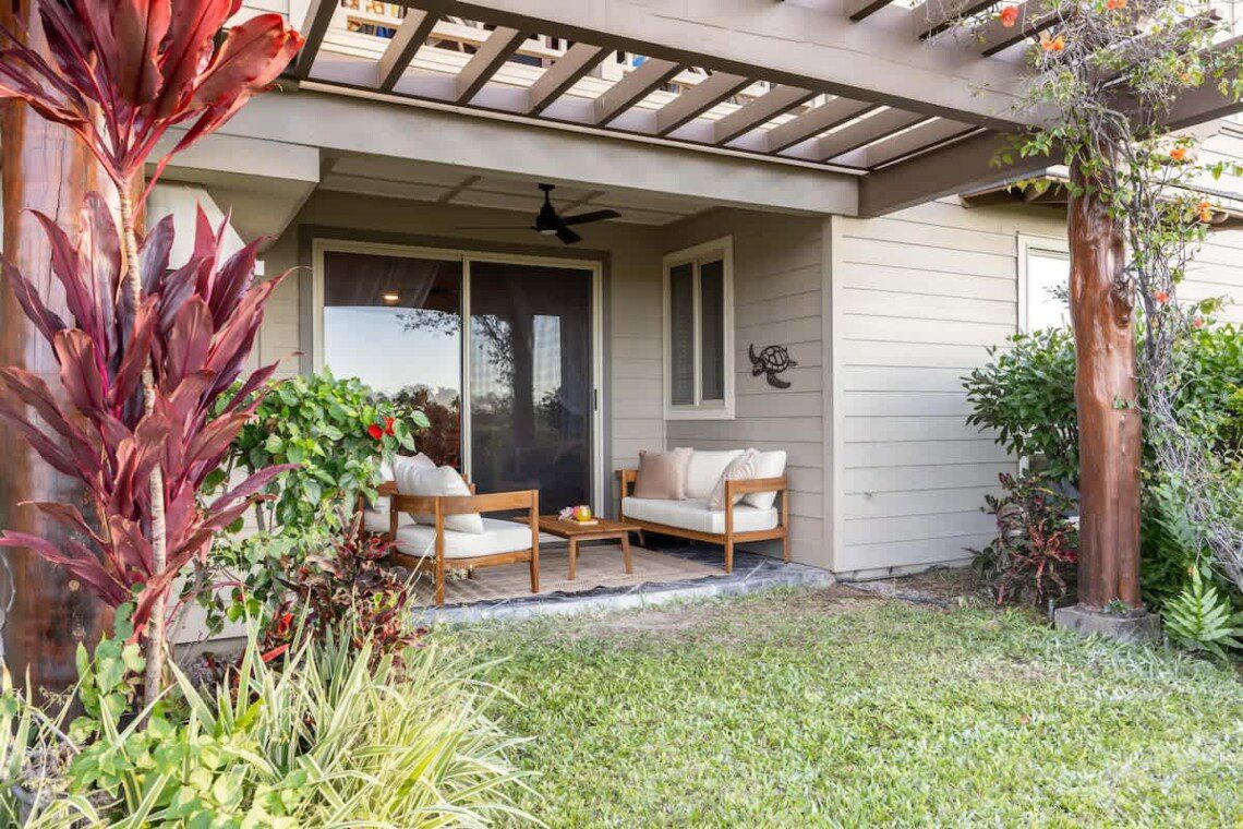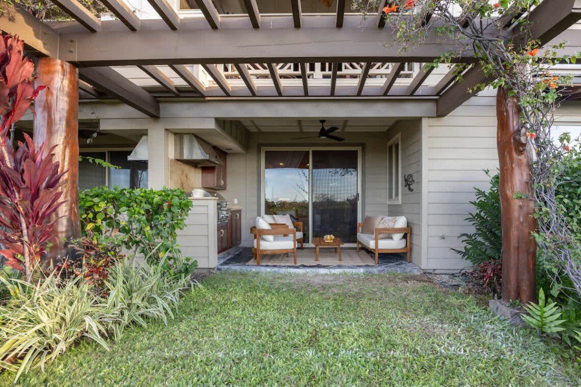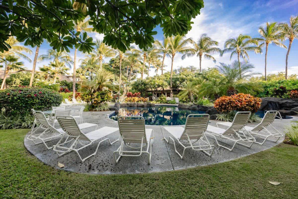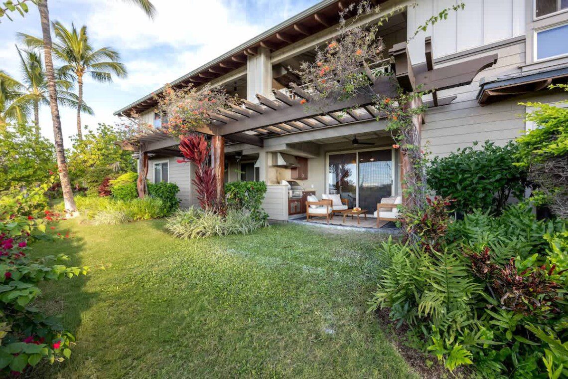 The unit is located in Palm Villas at Mauna Lani, a quiet, low-density community within the Mauna Lani Resort, known for its lush landscaping and relaxed island atmosphere.