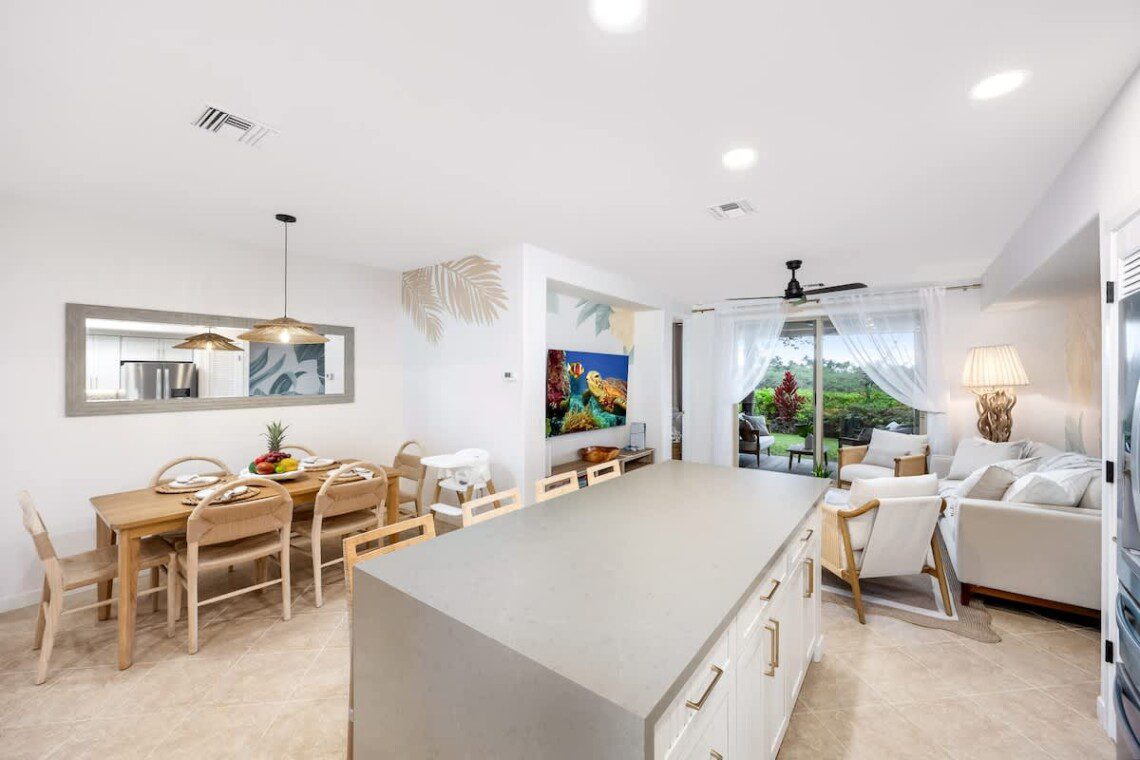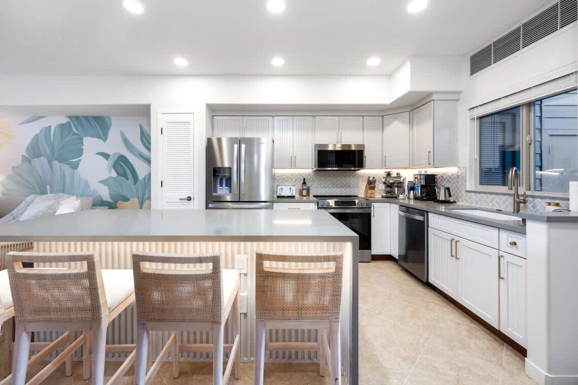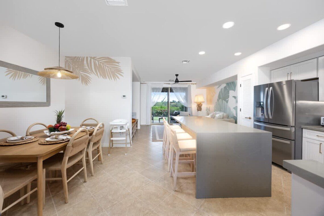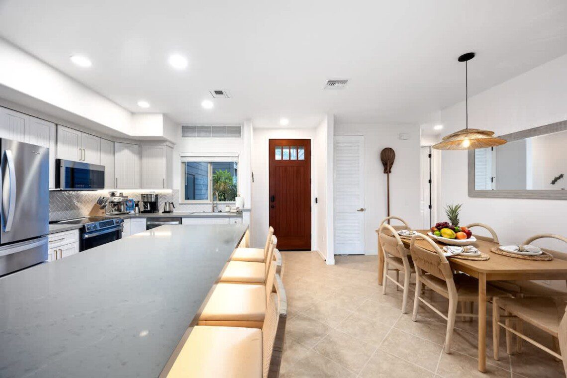 Fully stocked kitchen with modern appliances, a designated dining area, seating area by the island as well as a large pantry. Whether you’re preparing island-inspired meals or enjoying takeout, everything you need is at your fingertips.