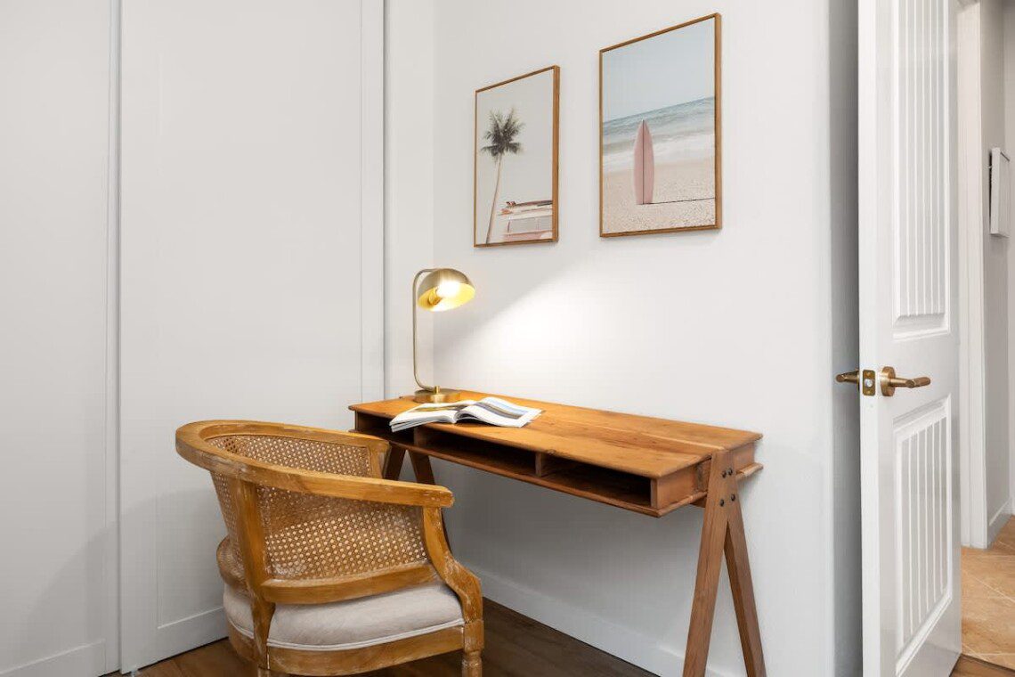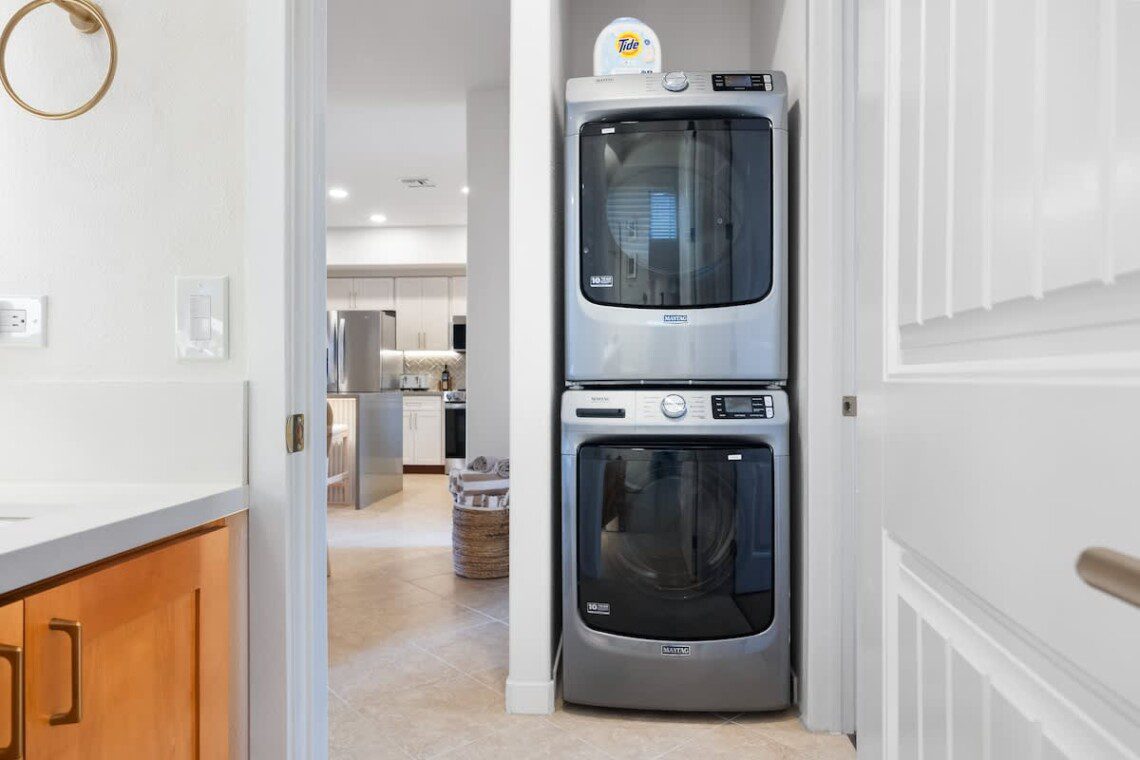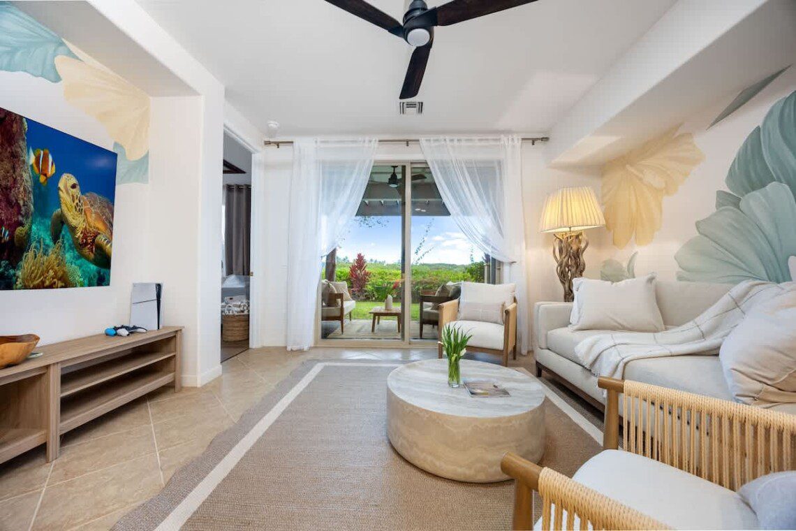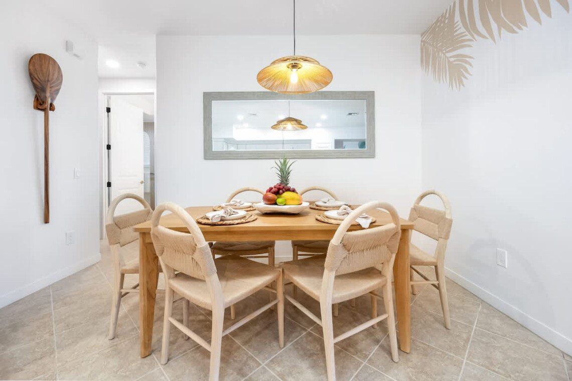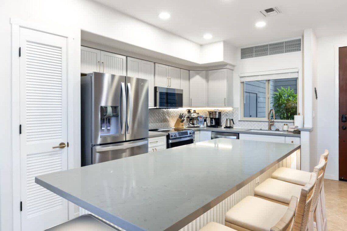 Fully stocked kitchen with modern appliances, a designated dining area, seating area by the island as well as a large pantry. Whether you’re preparing island-inspired meals or enjoying takeout, everything you need is at your fingertips.
