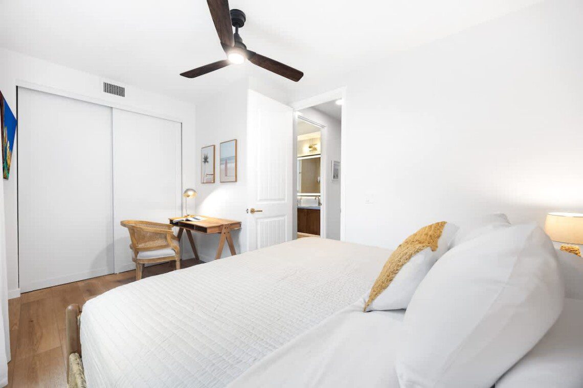 Second bedroom with a king-size bed, smart TV, ceiling fan, blackout shades and a designated office area. Bedroom comes with high-end mattress and 600 thread count cotton sheets.