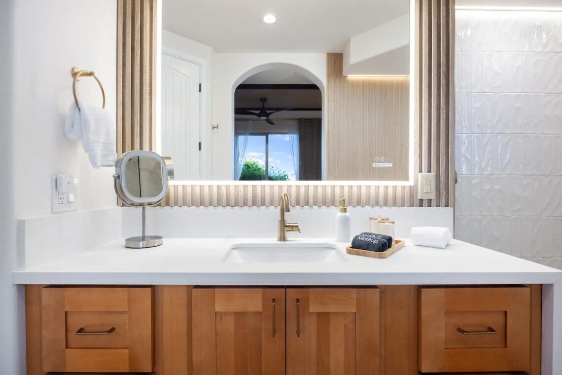 Just renovated! This 3BR/2BA Palm Villas ground-floor unit features tastefully upgraded interior with brand-new designer bathrooms, luxury king mattresses, elegant decor, and a fully stocked kitchen. Enjoy resort-style amenities: waterfall pool, spa grotto, gym, and BBQs. Walk to Mauna Lani Beach Club, petroglyph trails, shops, and dining. Central A/C, 75″ smart TV, washer/dryer, and garage with beach gear included. Peaceful, lush setting—perfect for couples, families, or remote work escapes.