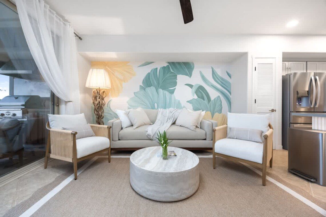 Cozy and welcoming living room with high ceilings, opening onto an expansive lanai overlooking the park — the perfect place to unwind and take in the aloha spirit.