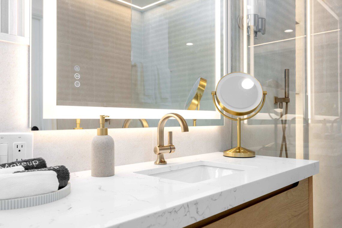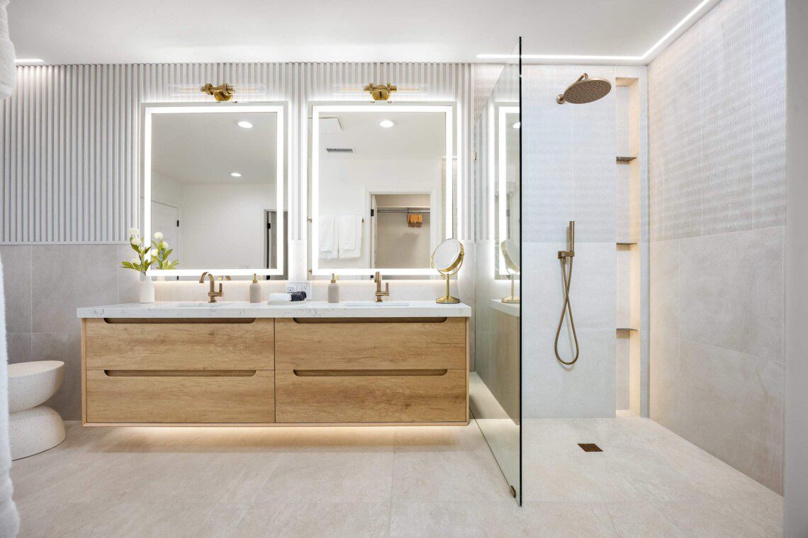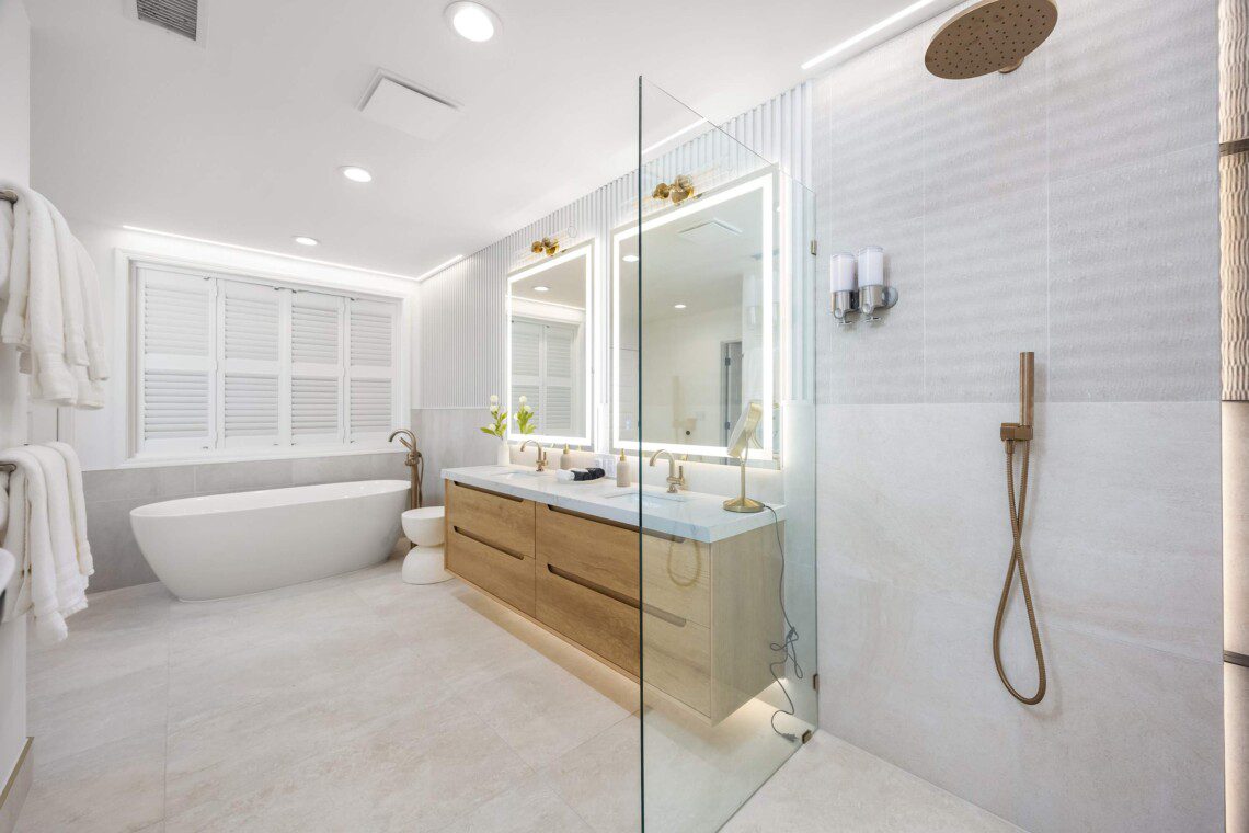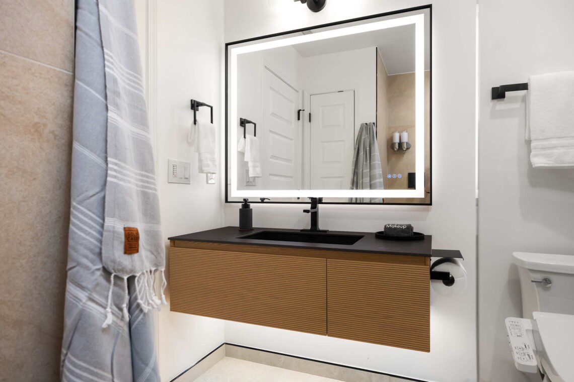 Primary bedroom with king-size bed, smart TV, ceiling fan, blackout shades, and a private bathroom featuring oversized showers AND soaking tub. Includes a walk-in closet, dresser, and a designated office area. A roll-out bed with a thick 4-inch mattress that can be added to any room.