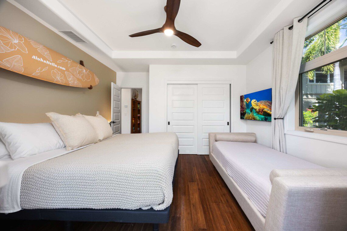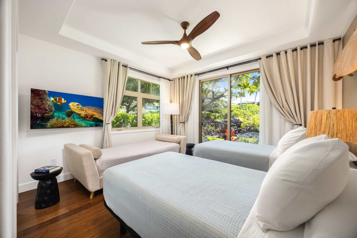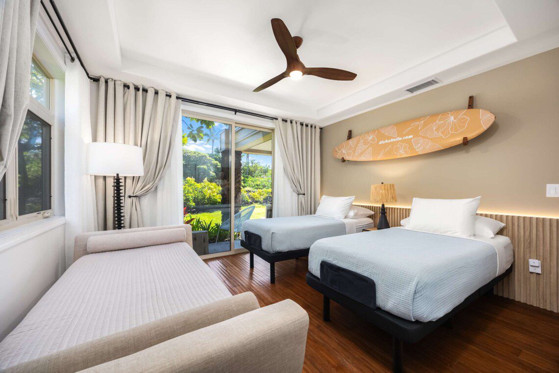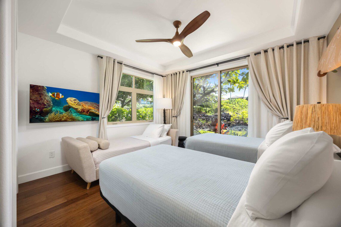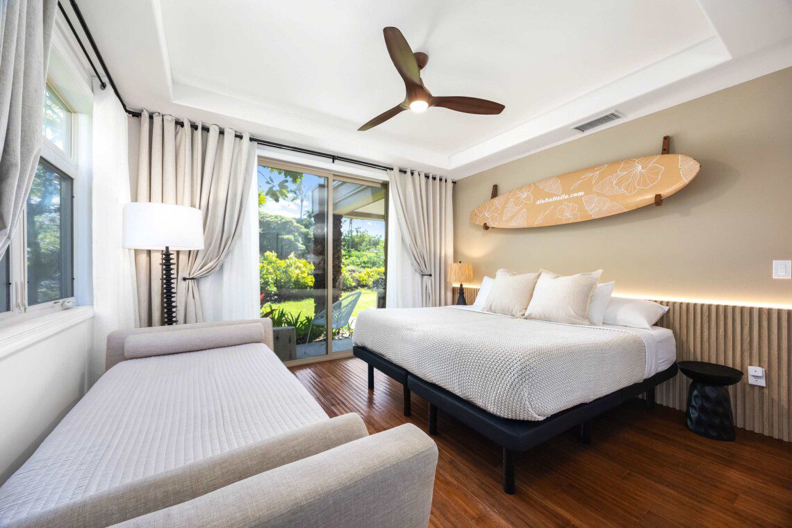 Modern Hawaiian décor, plush bedding (600 thread count cotton sheets), Stern & Foster Mattresses, and blackout shades in every room for restful sleep.