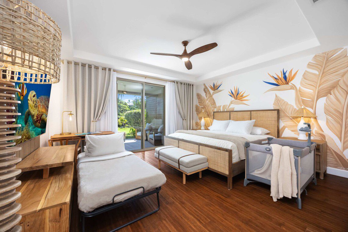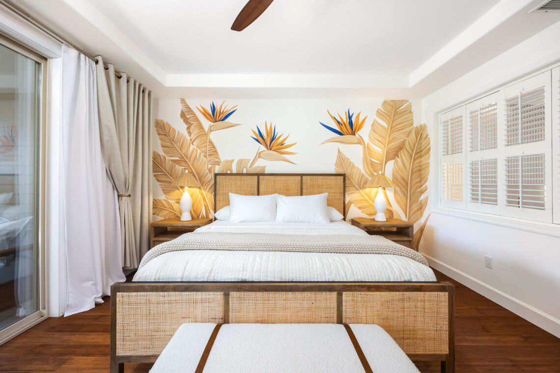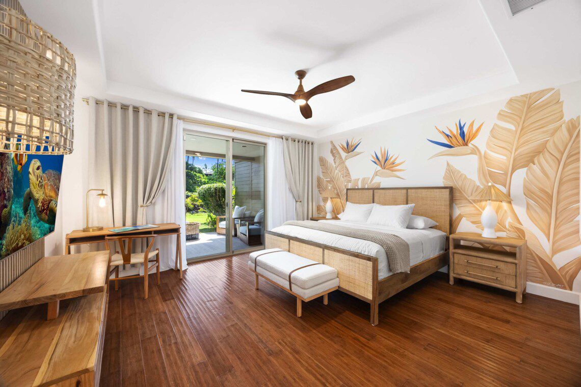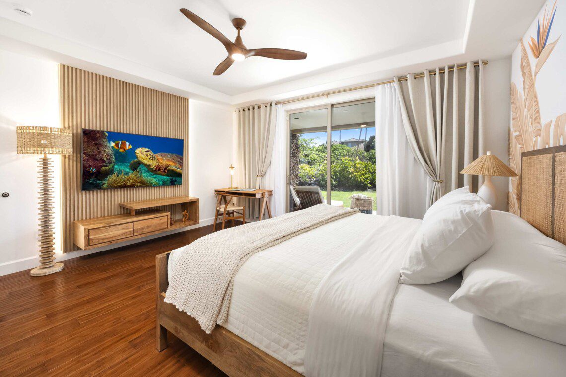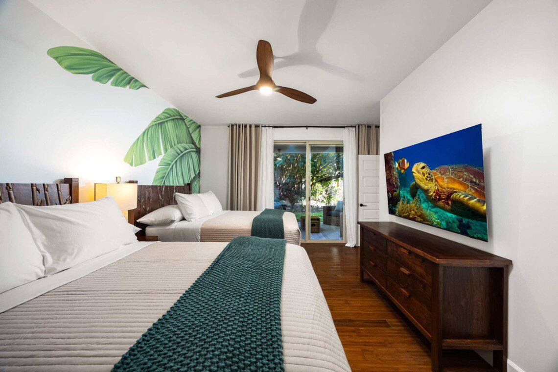 Modern Hawaiian décor, plush bedding (600 thread count cotton sheets), Stern & Foster Mattresses, and blackout shades in every room for restful sleep.