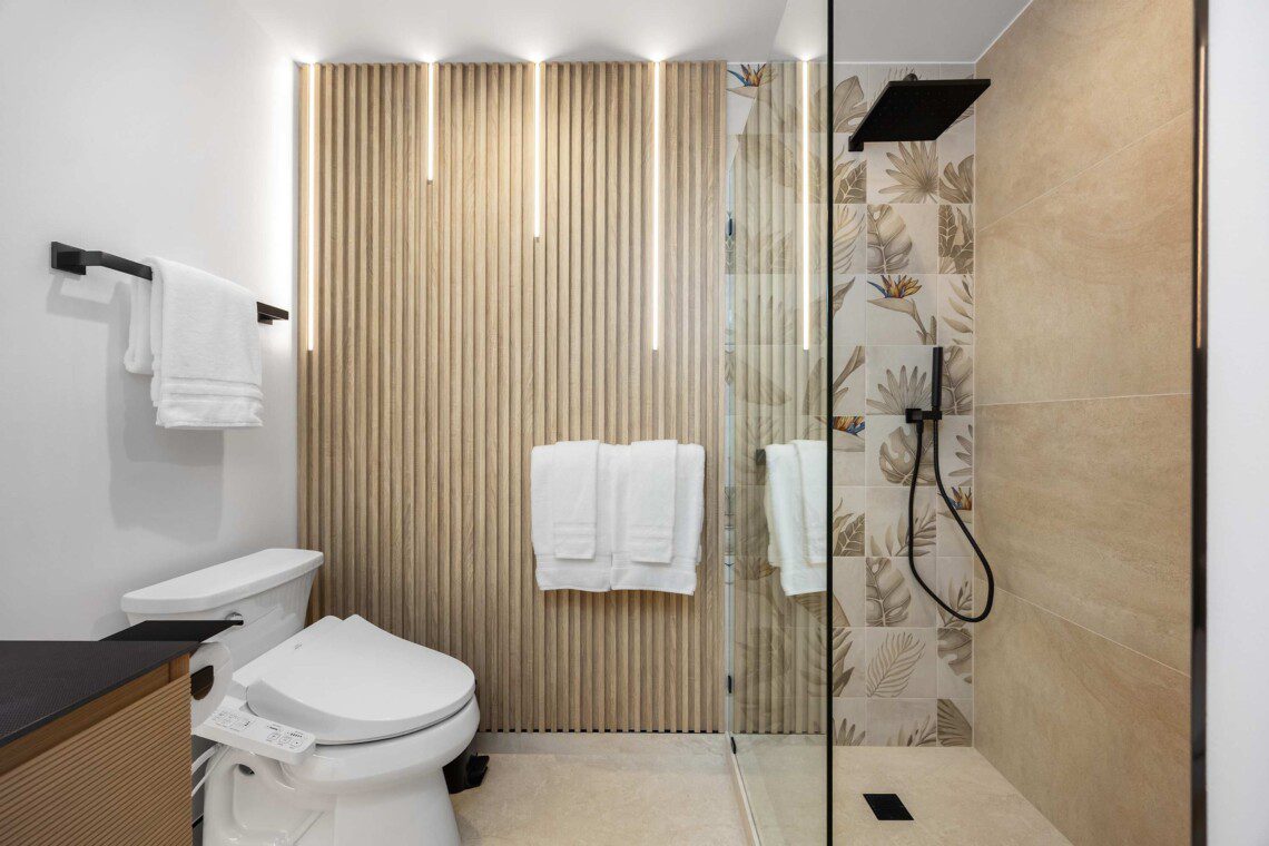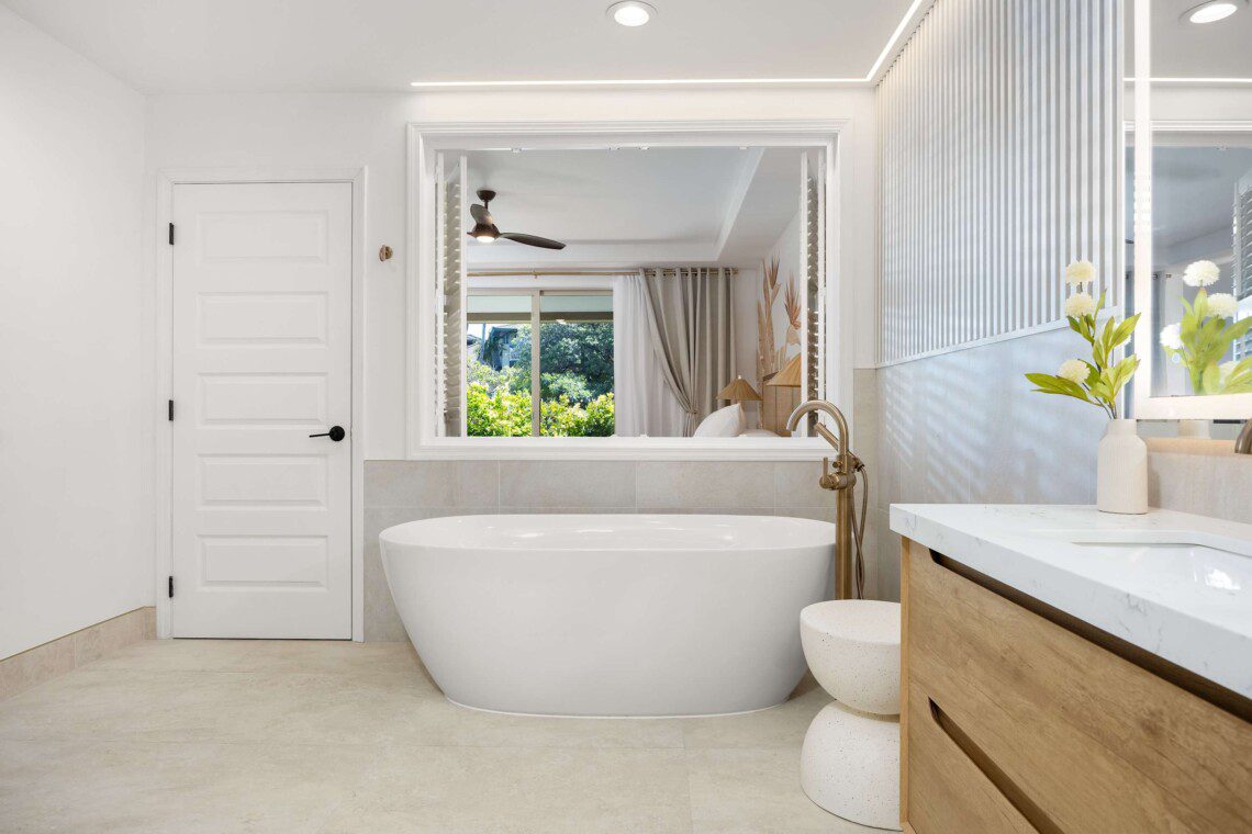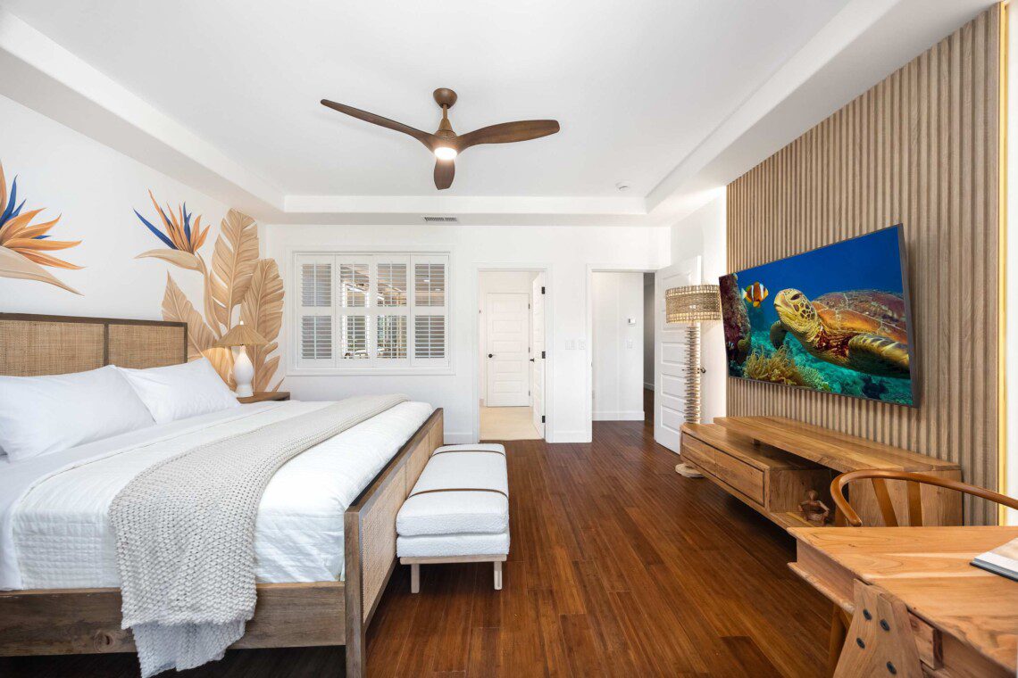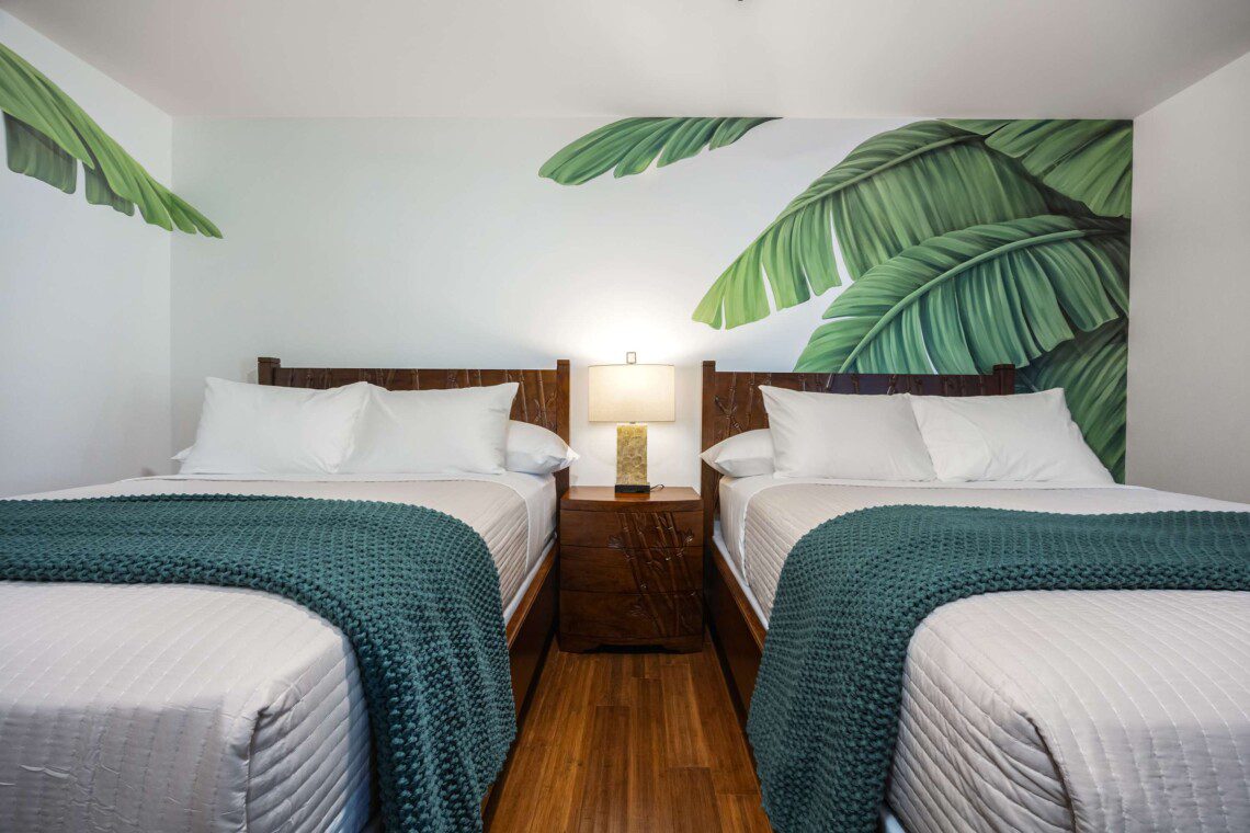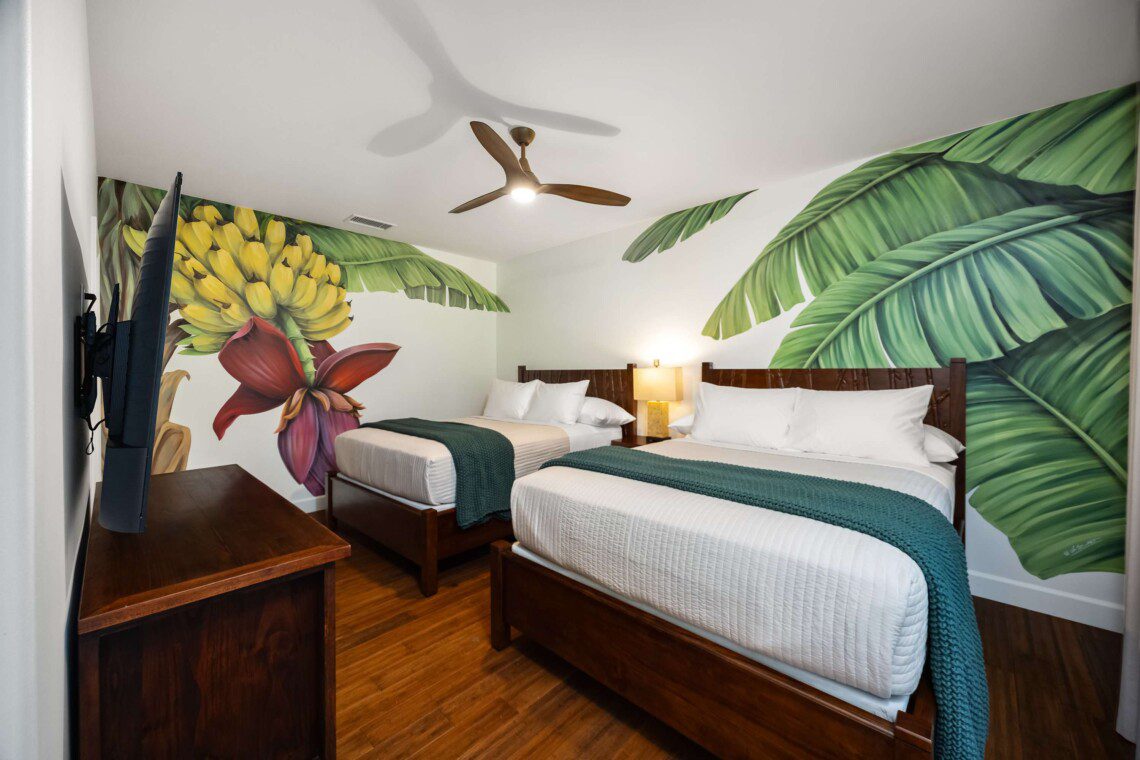 Modern Hawaiian décor, plush bedding (600 thread count cotton sheets), Stern & Foster Mattresses, and blackout shades in every room for restful sleep.