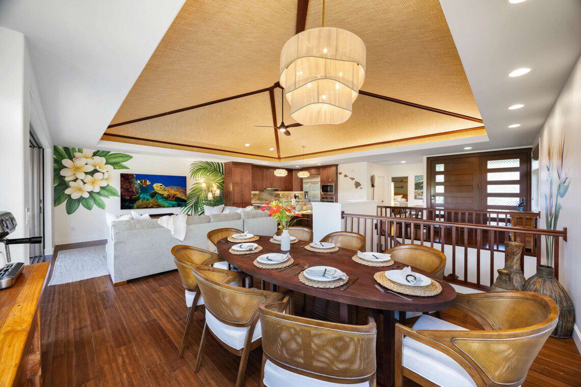 Fully stocked kitchen with modern appliances and a dining area that opens to the lanai with additional seating. Whether you’re preparing island-inspired meals or enjoying takeout, everything you need is at your fingertips.