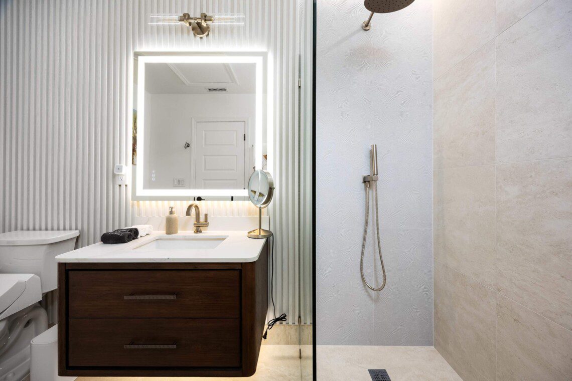 Primary bedroom with king-size bed, smart TV, ceiling fan, blackout shades, and a private bathroom featuring oversized showers AND soaking tub. Includes a walk-in closet, dresser, and a designated office area. A roll-out bed with a thick 4-inch mattress that can be added to any room.