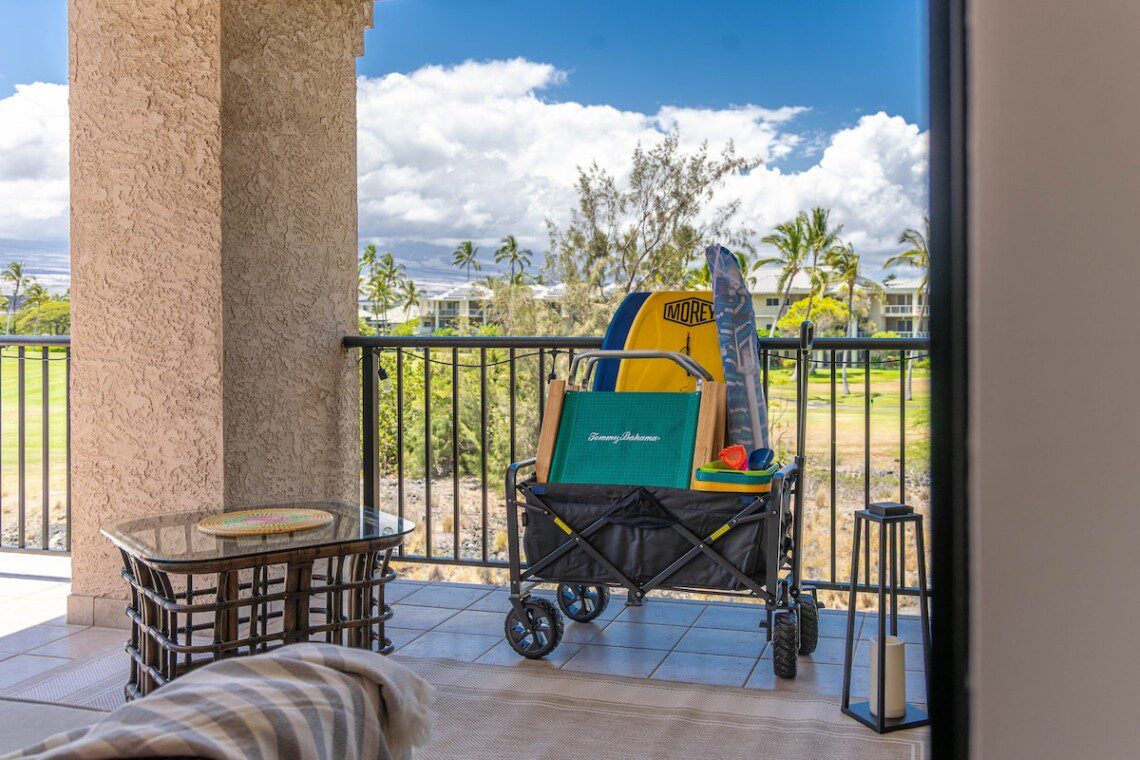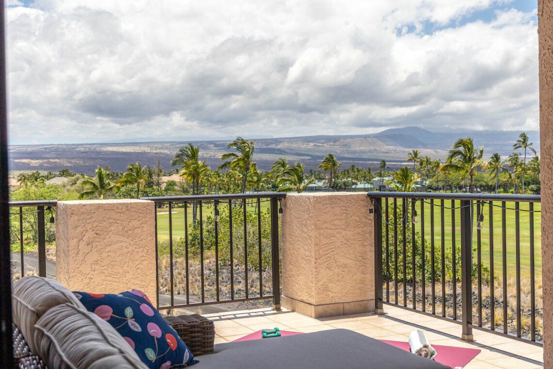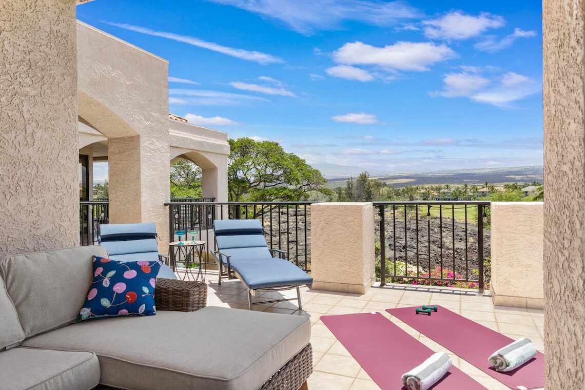 Within Shores at Waikoloa – large pool with hot tub, plenty of seating and sun bathing areas. Large Air-Conditioned fitness center, Lots of parking. Two tennis courts. BBQ area. Beautiful koi ponds. Unforgettable sunsets – every day.