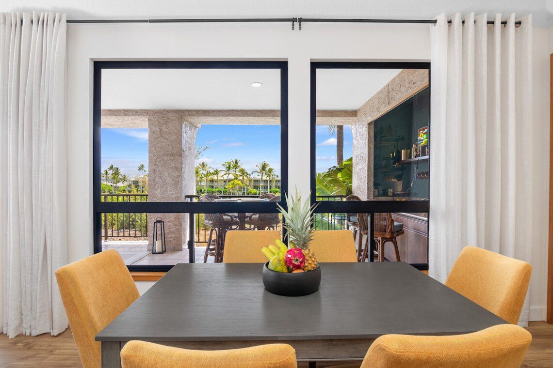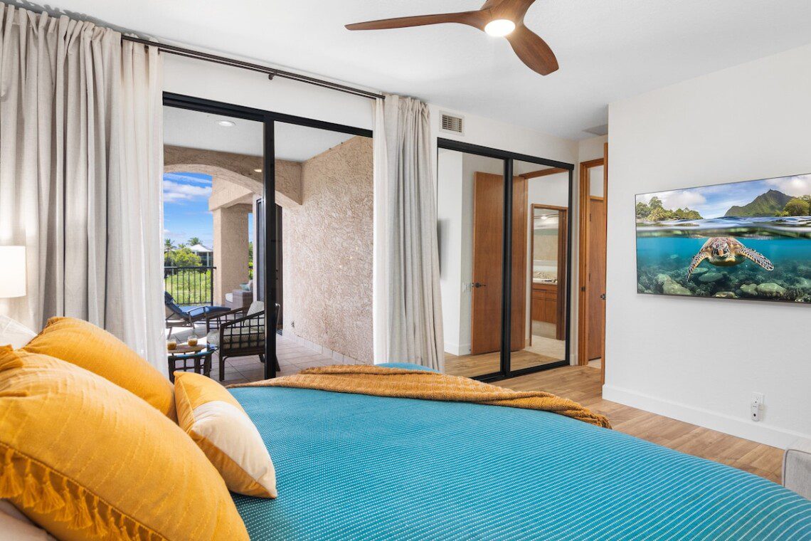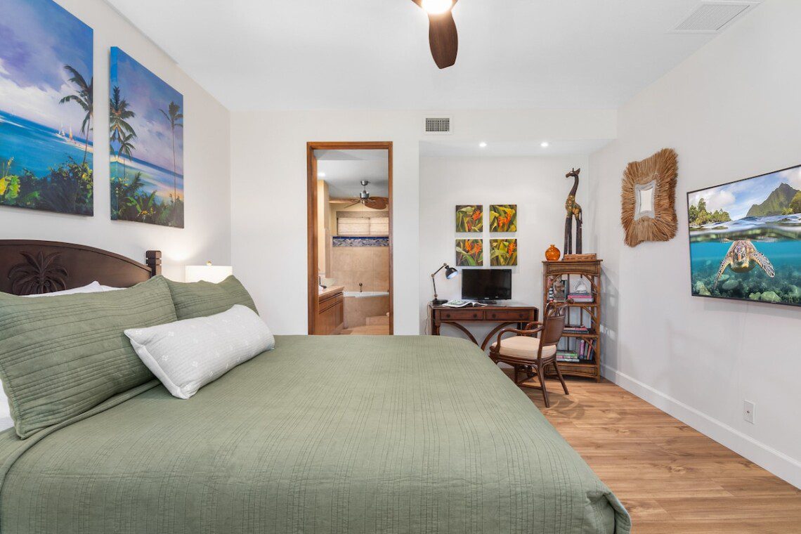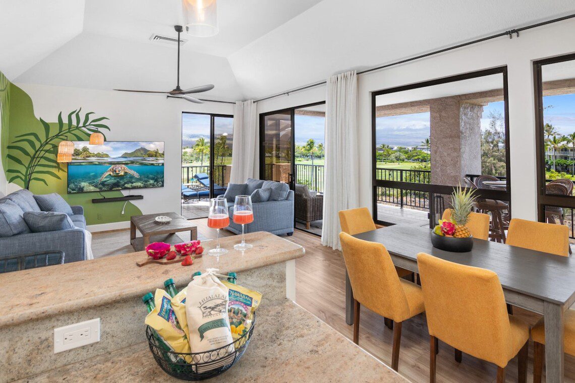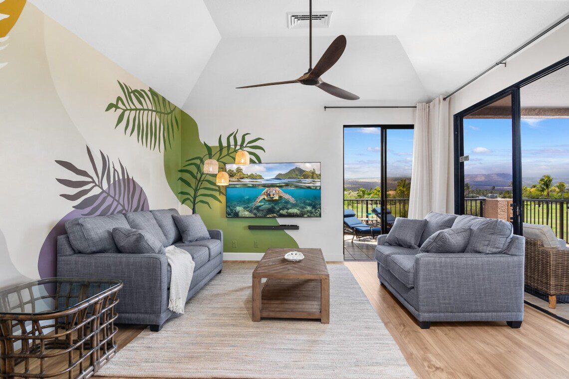 Relax on the expansive lanai with ocean, mountains, and golf course views in this newly remodeled penthouse. Enjoy sunsets with a drink from your private bar. High ceilings, abundant natural light, and two large bedrooms, each with a king bed, blackout shades, attached bathroom, 600-ply cotton sheets, AC, ceiling fans, TV, and an extra folding bed. The chef’s kitchen is fully stocked. Beach gear is provided. Amenities include a pool, hot tub, gym, tennis courts, BBQ, golf, and beach access.