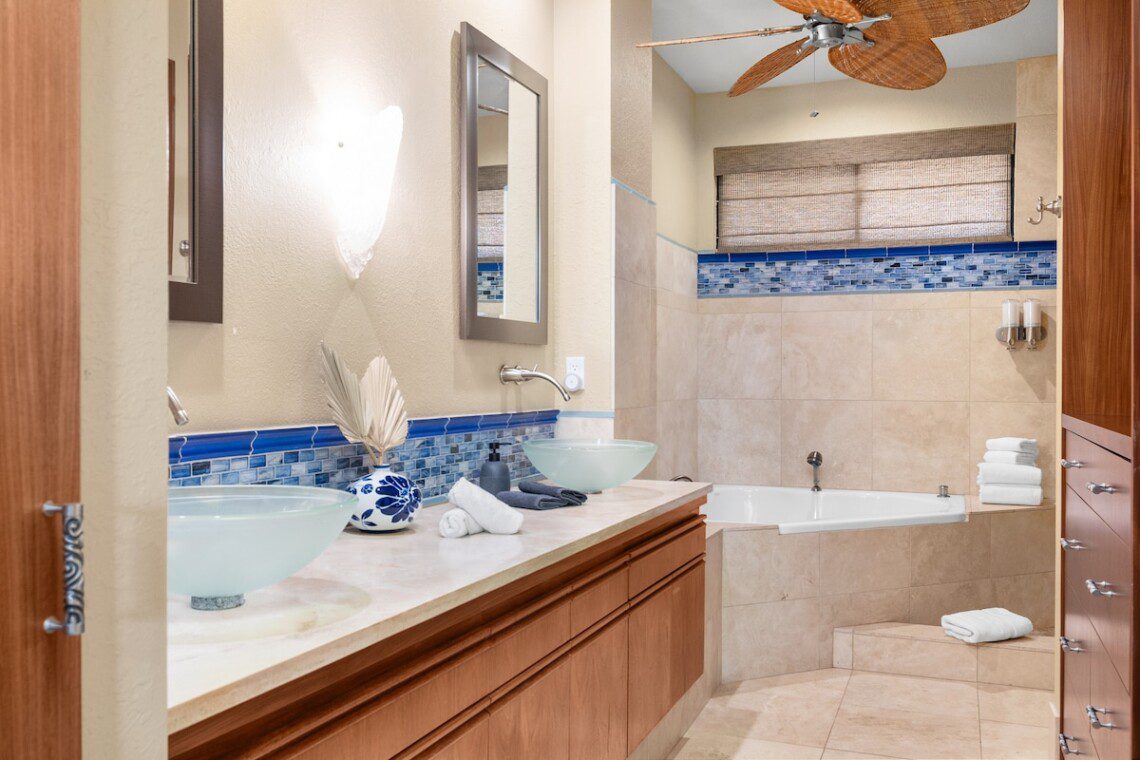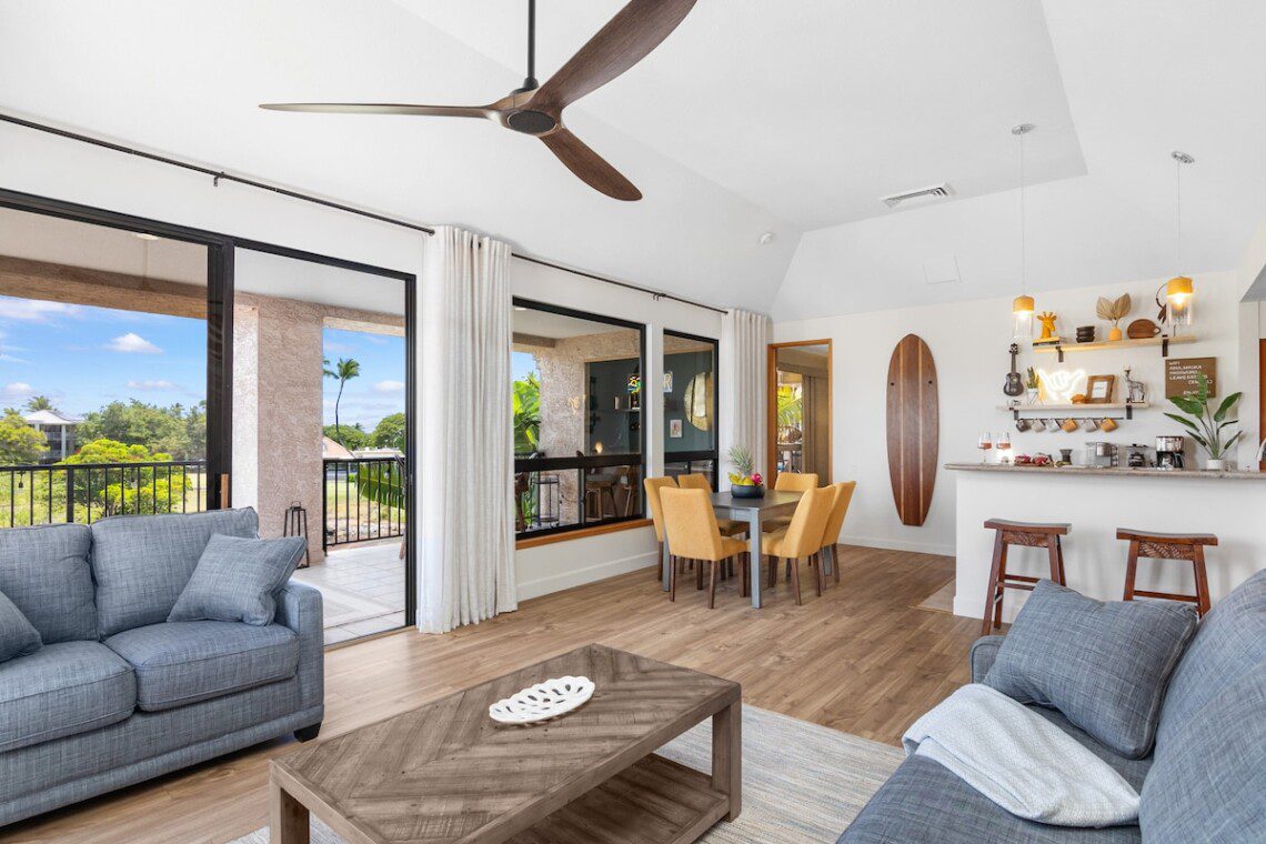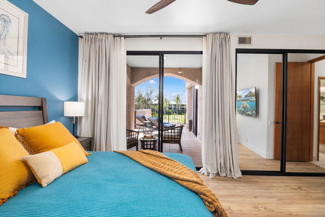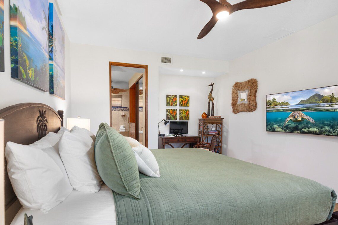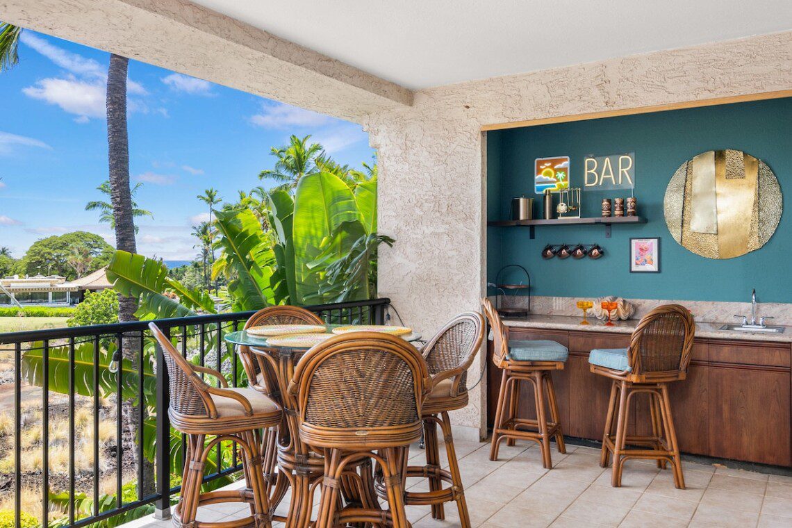 Relax on the expansive lanai with ocean, mountains, and golf course views in this newly remodeled penthouse. Enjoy sunsets with a drink from your private bar. High ceilings, abundant natural light, and two large bedrooms, each with a king bed, blackout shades, attached bathroom, 600-ply cotton sheets, AC, ceiling fans, TV, and an extra folding bed. The chef’s kitchen is fully stocked. Beach gear is provided. Amenities include a pool, hot tub, gym, tennis courts, BBQ, golf, and beach access.