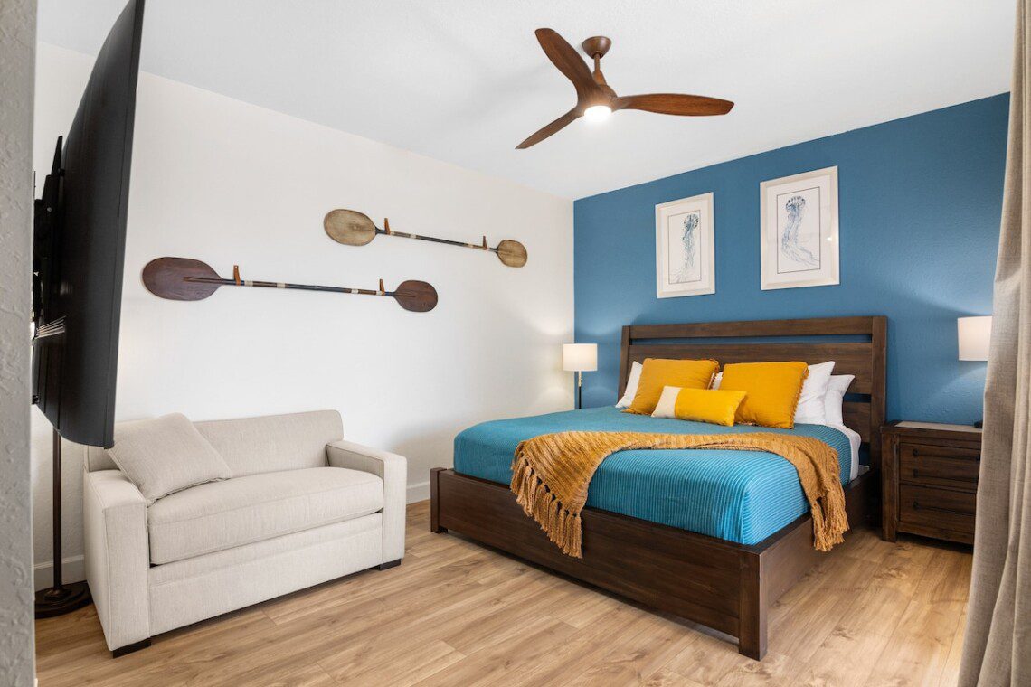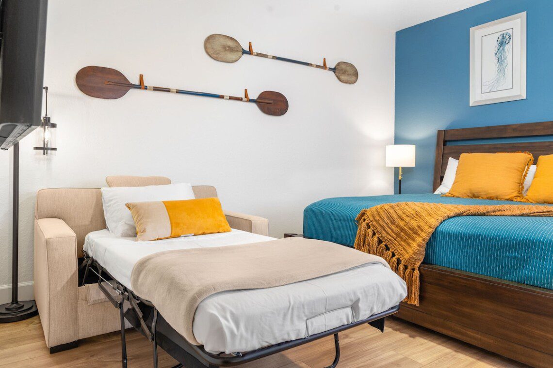 king bed, attached bathroom with oversized shower, TV, full blackout shades, Sleeper sofa