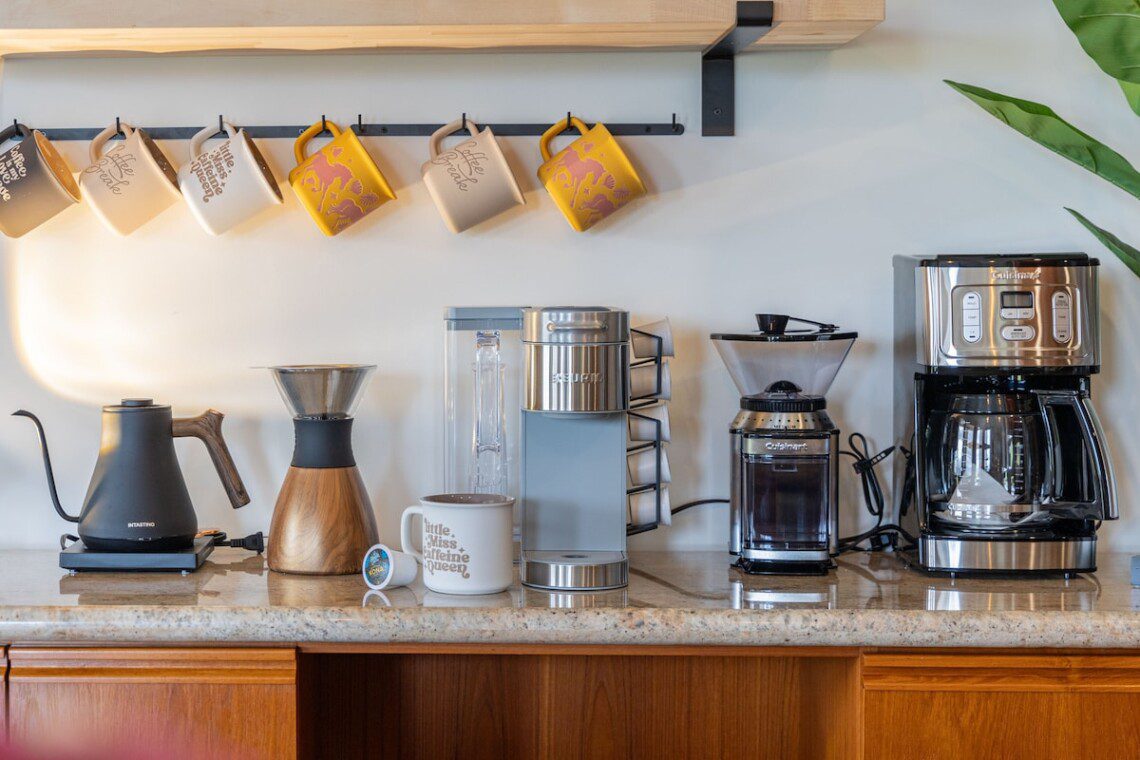 Coffee station with drip, pour over and capsule coffee options.