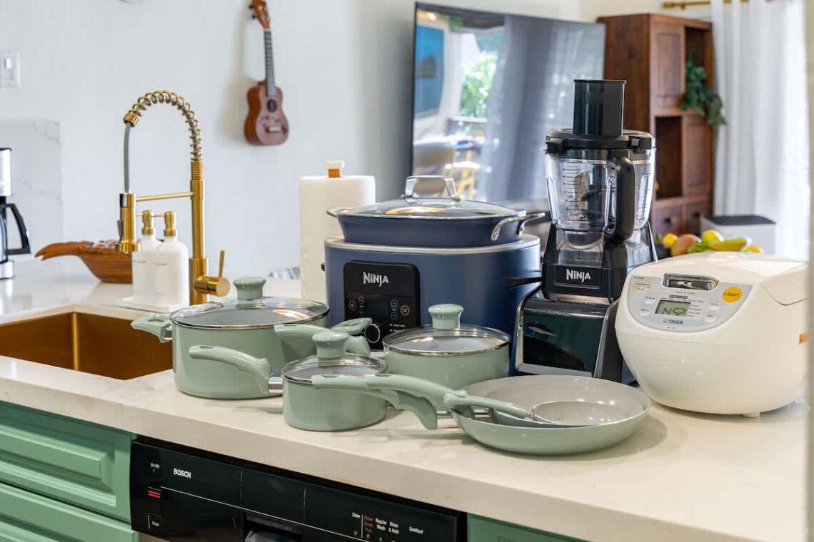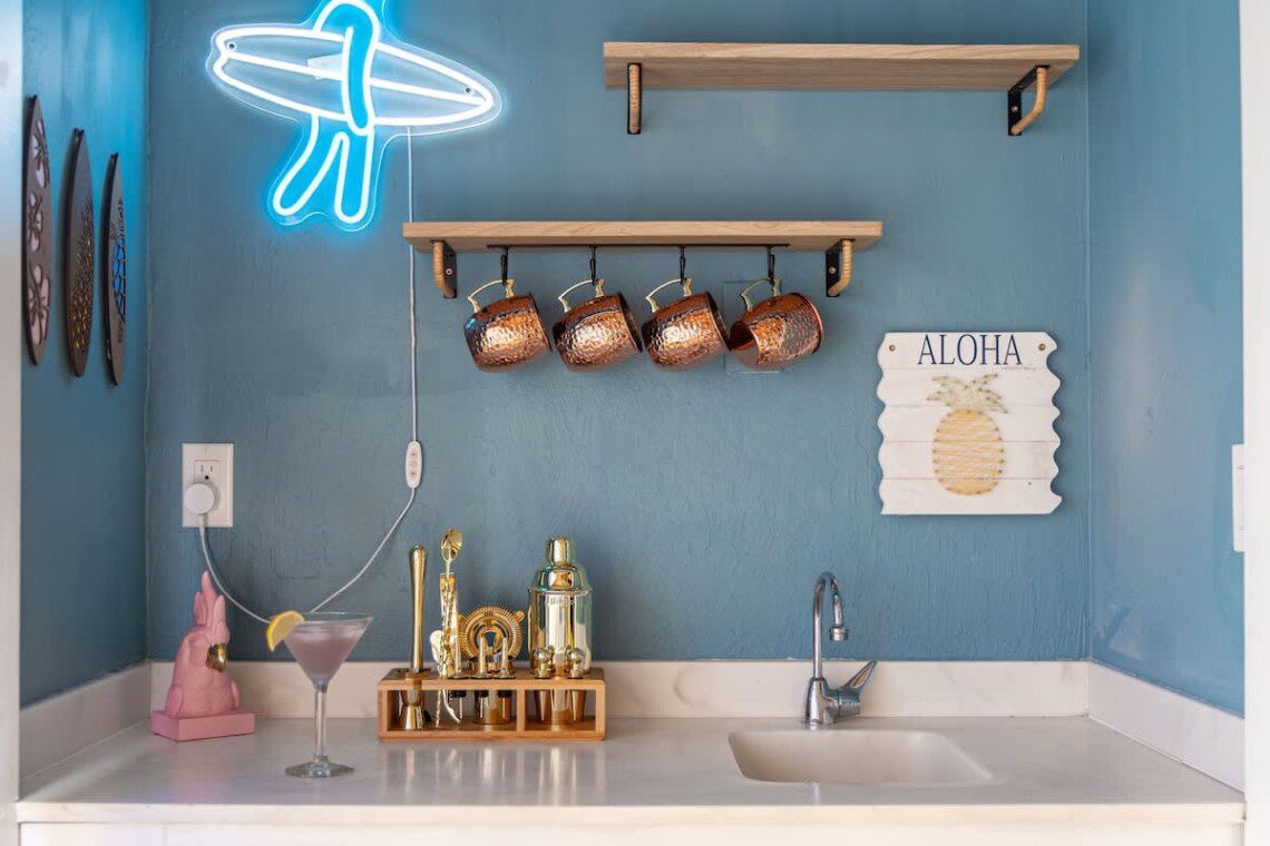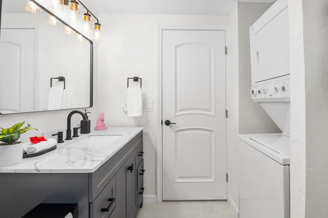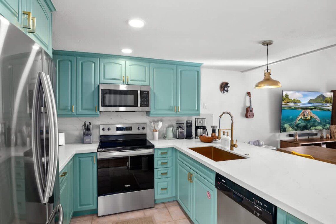 Fully stocked kitchen with modern appliances. Open layout with a bar. Whether you’re preparing island-inspired meals or enjoying takeout, everything you need is at your fingertips.