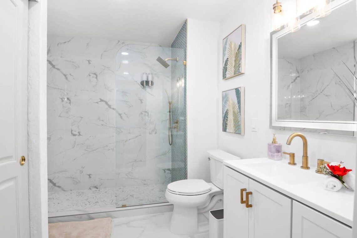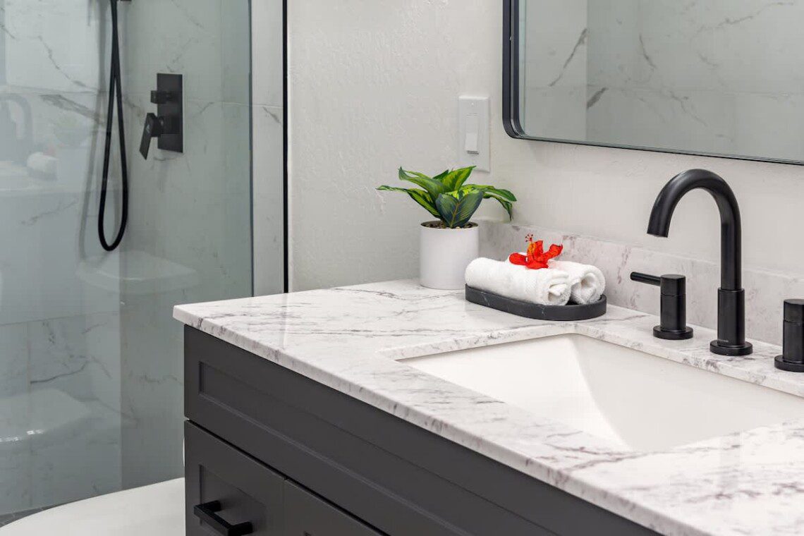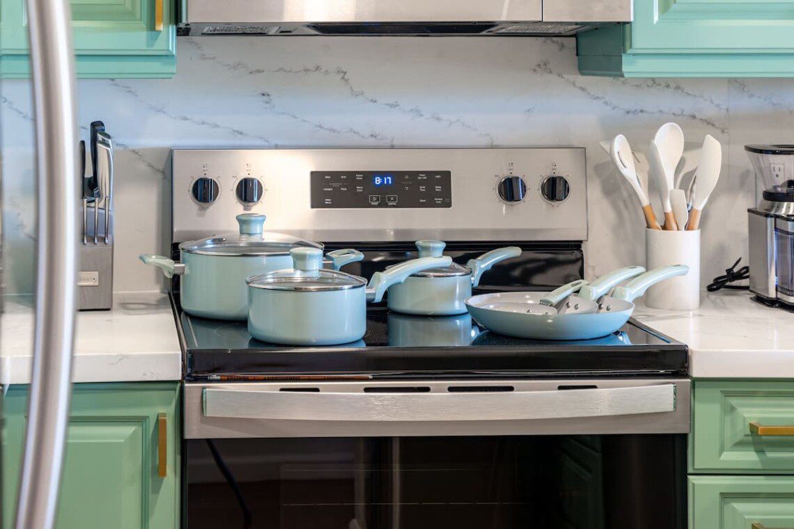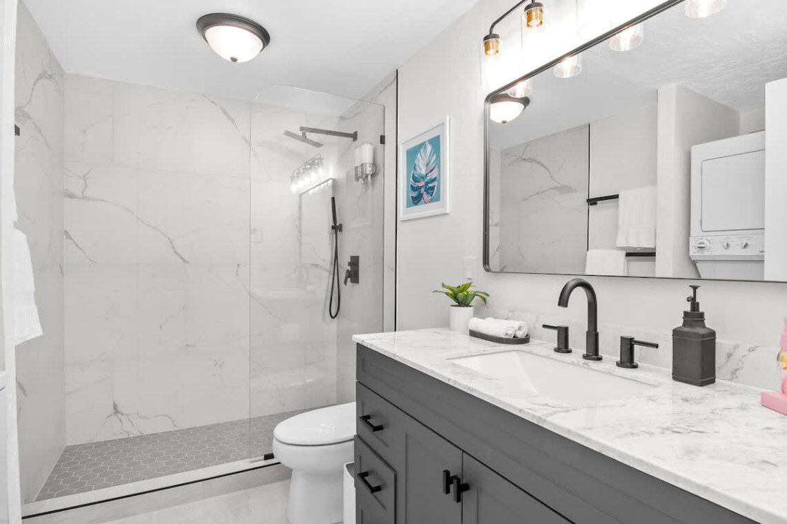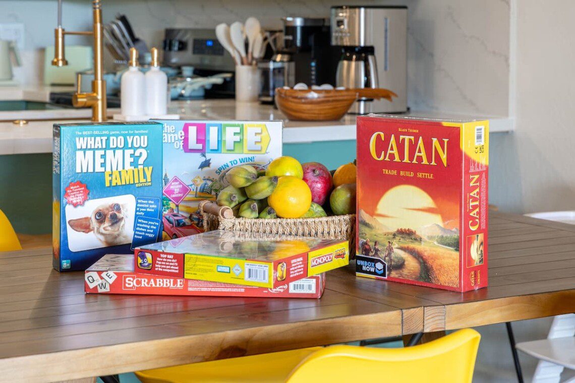 Fully stocked kitchen with modern appliances. Open layout with a bar. Whether you’re preparing island-inspired meals or enjoying takeout, everything you need is at your fingertips.