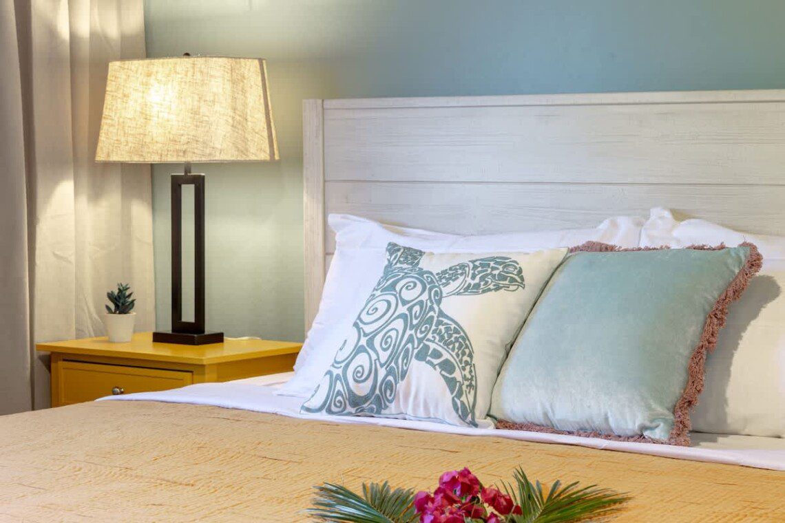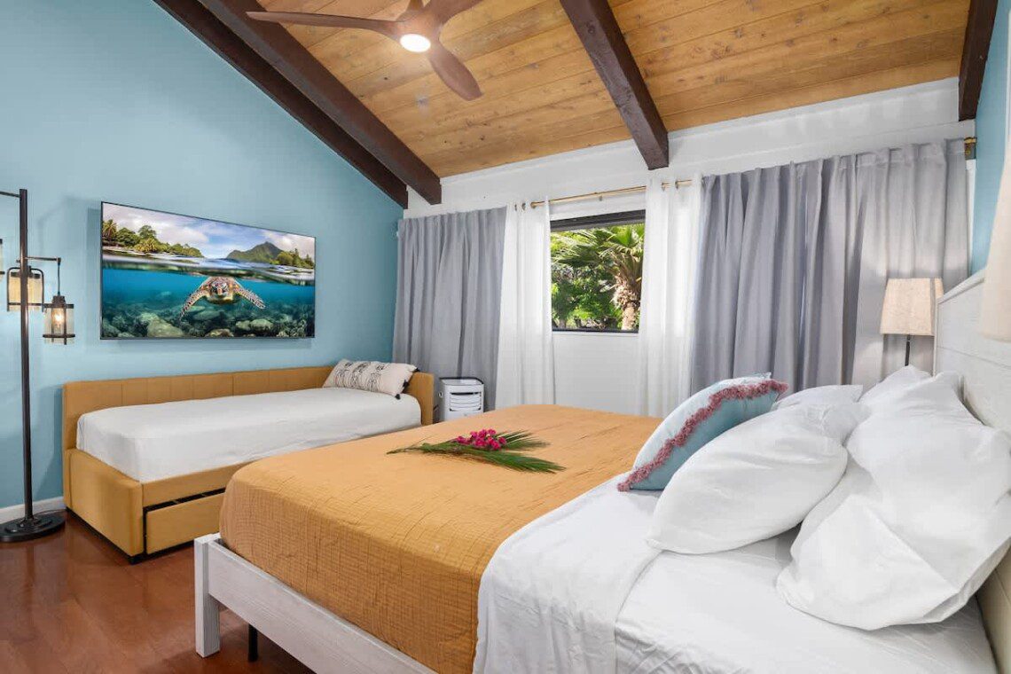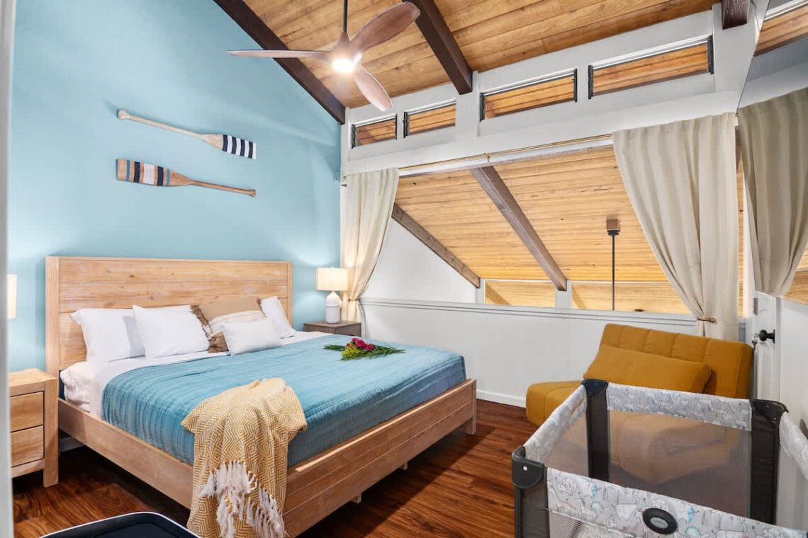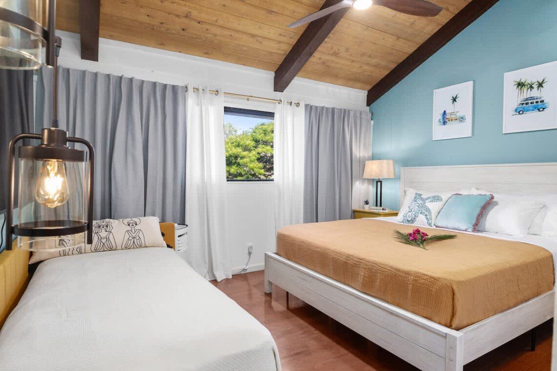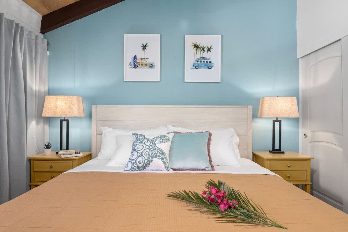 Modern Hawaiian décor, plush bedding, and blackout shades in every room for restful sleep.
