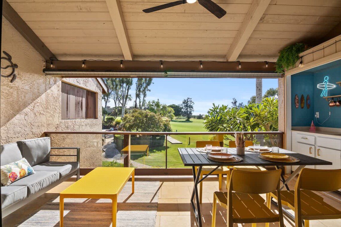 Bright and airy living room / dining room with golf views, opening onto an expansive lanai overlooking the vast green fields — the perfect place to unwind and take in the aloha spirit, TV, sleeper sofa, twin bed, AC.