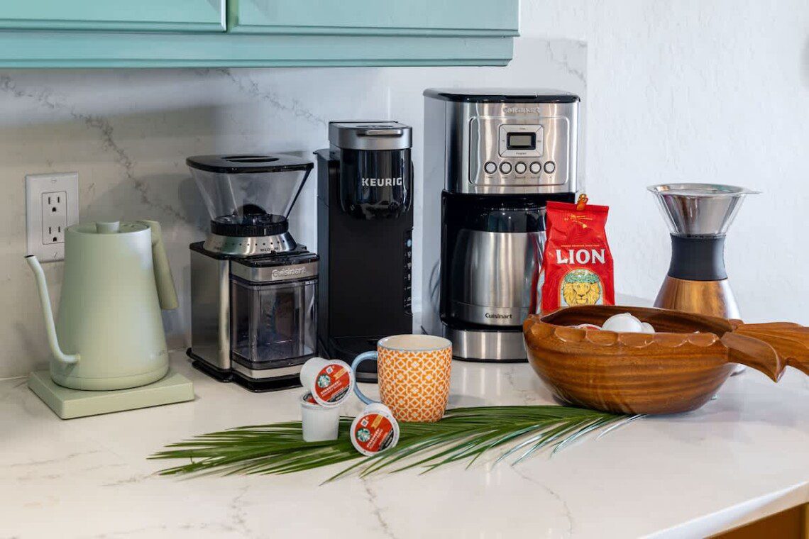 Coffee station with drip, pour-over, and capsule coffee options.